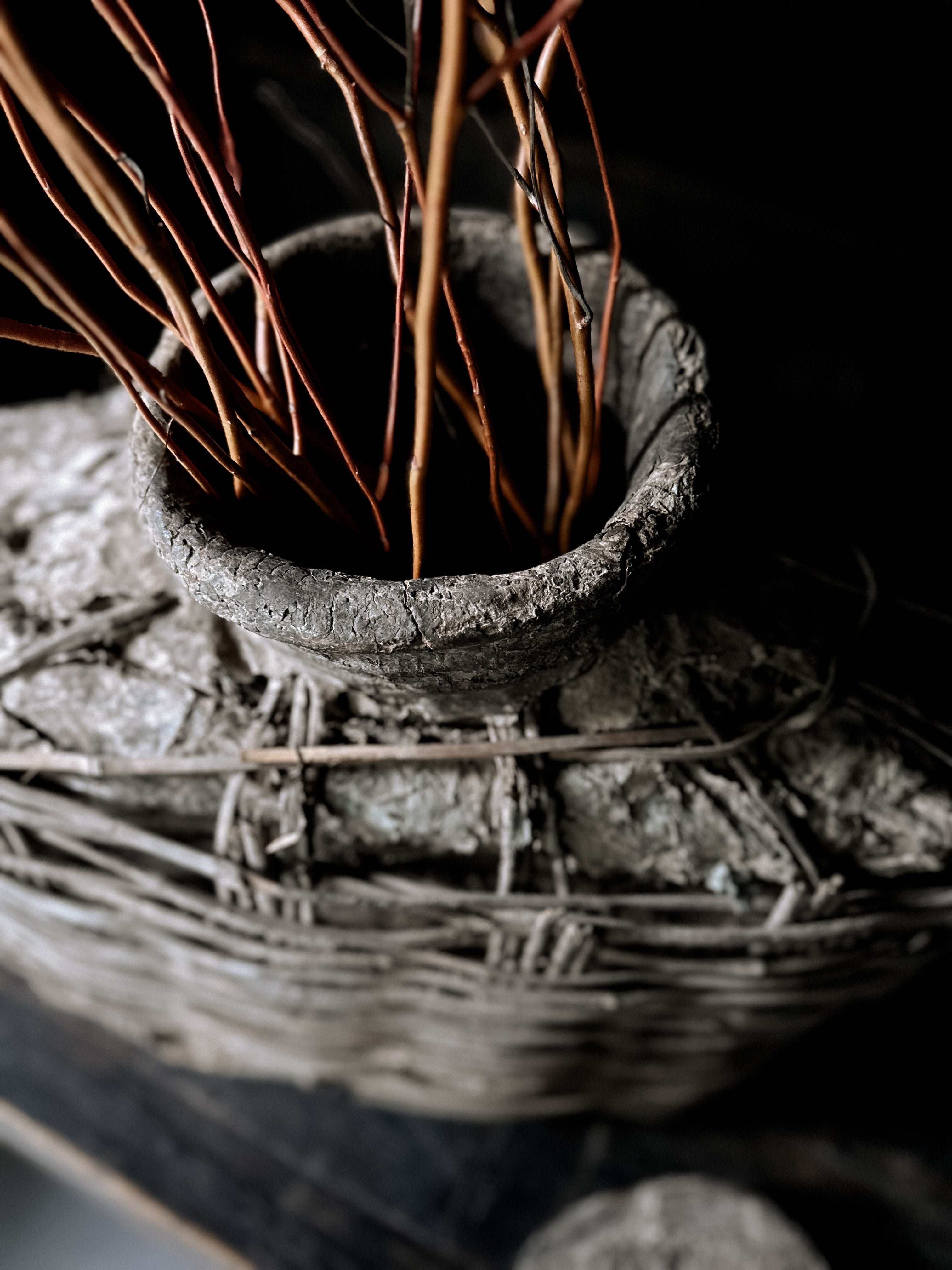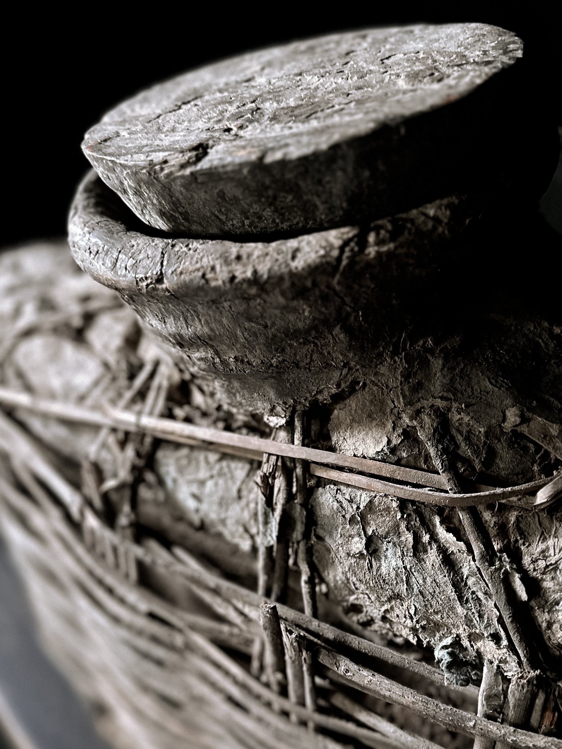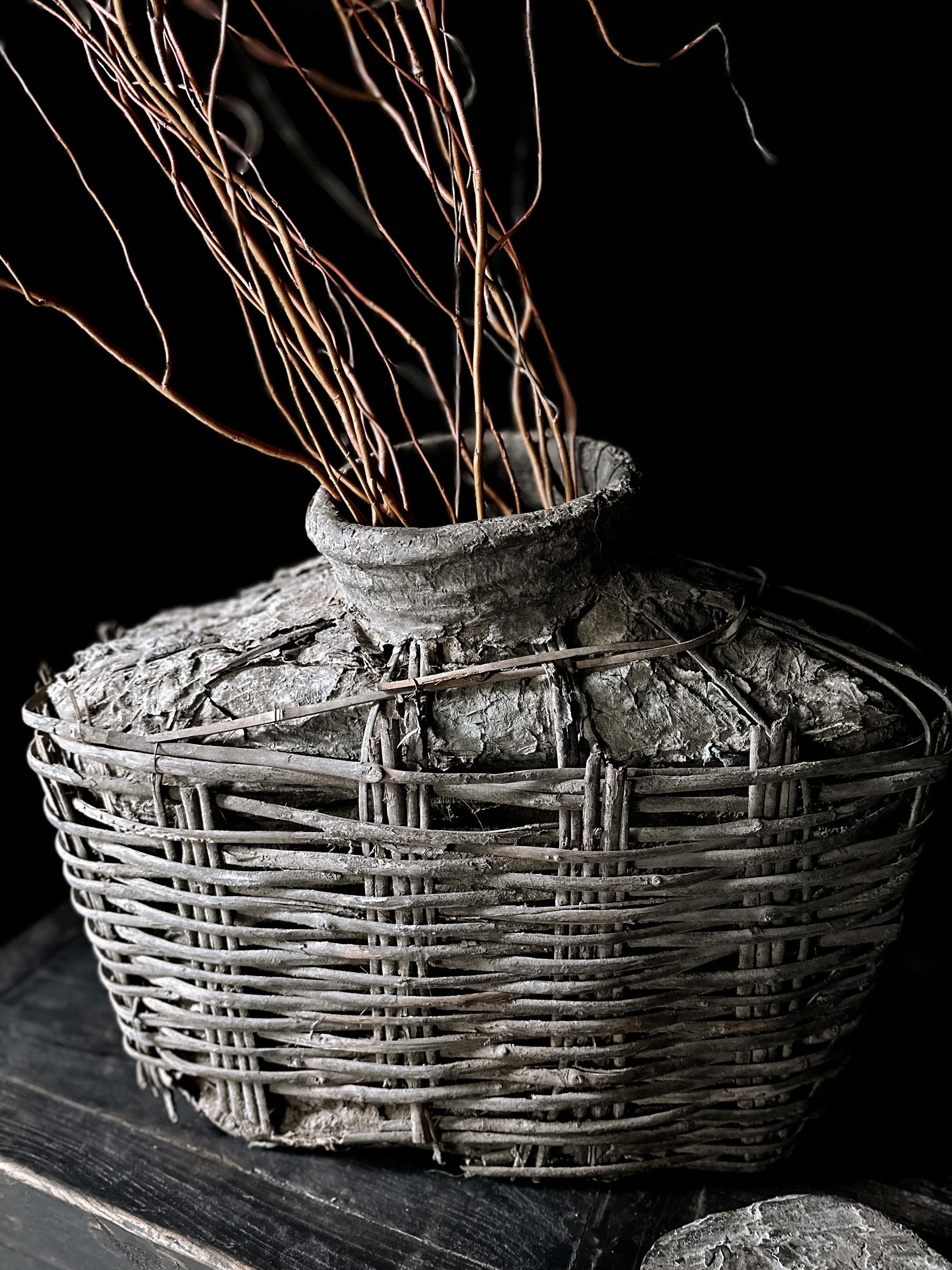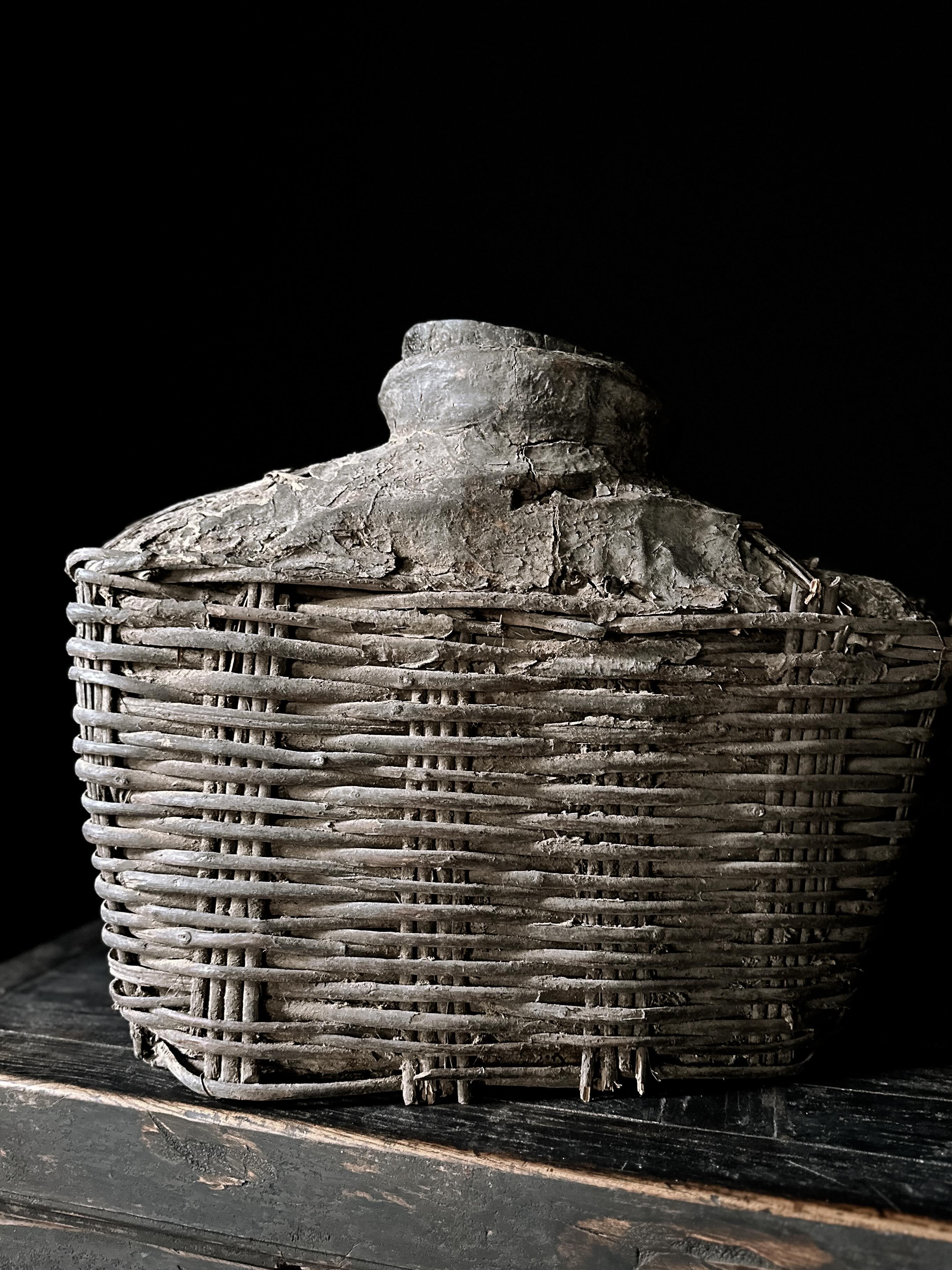 Die Körbe wurden früher in China verwendet, um Essig oder Öl zu lagern, wahrscheinlich für Lampen. Eine aufgetragene Lehm- bzw. Lederpaste schützte die Körbe vor Wasser. Im Laufe der Zeit ist die Paste gerissen, und eine einzigartige Patina ist auf der Oberfläche entstanden.