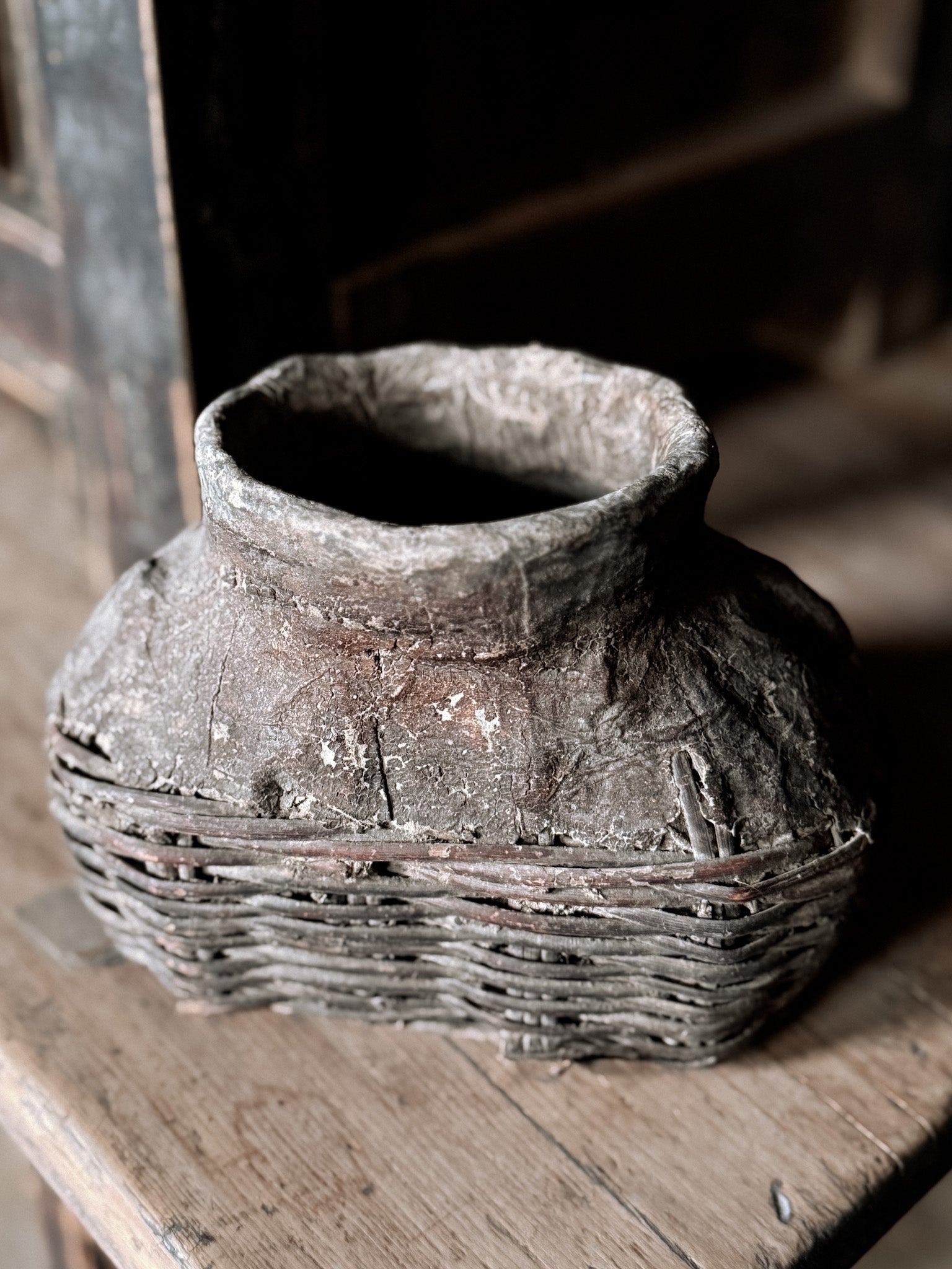 Von Hand geformt und vom Gebrauch gezeichnet: Diese alten Mini-Lehmkörbe aus ländlichen Regionen Chinas verkörpern eine stille, funktionale Schönheit. Gefertigt aus geflochtenem Rohr und mit natürlichem Lehm überzogen, dienten sie einst als einfache Alltagsgefäße – robust, nützlich und von Hand gemacht.