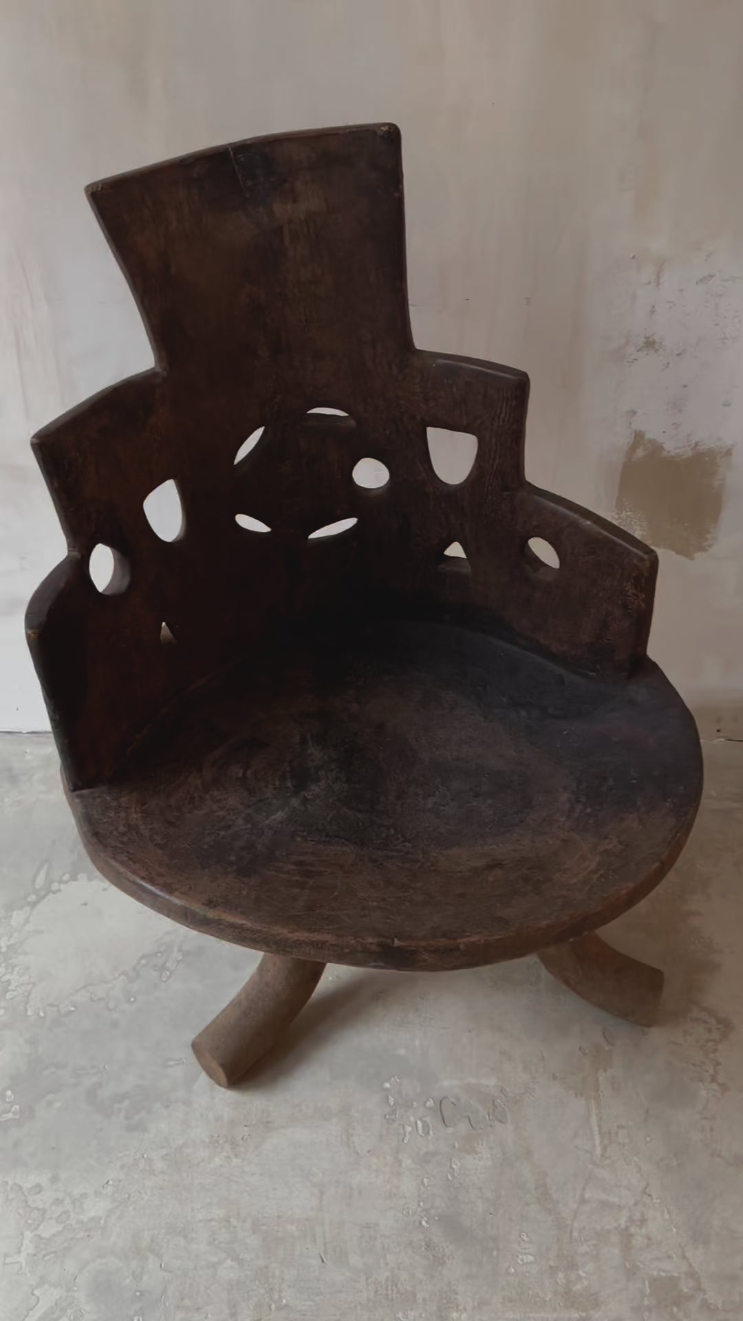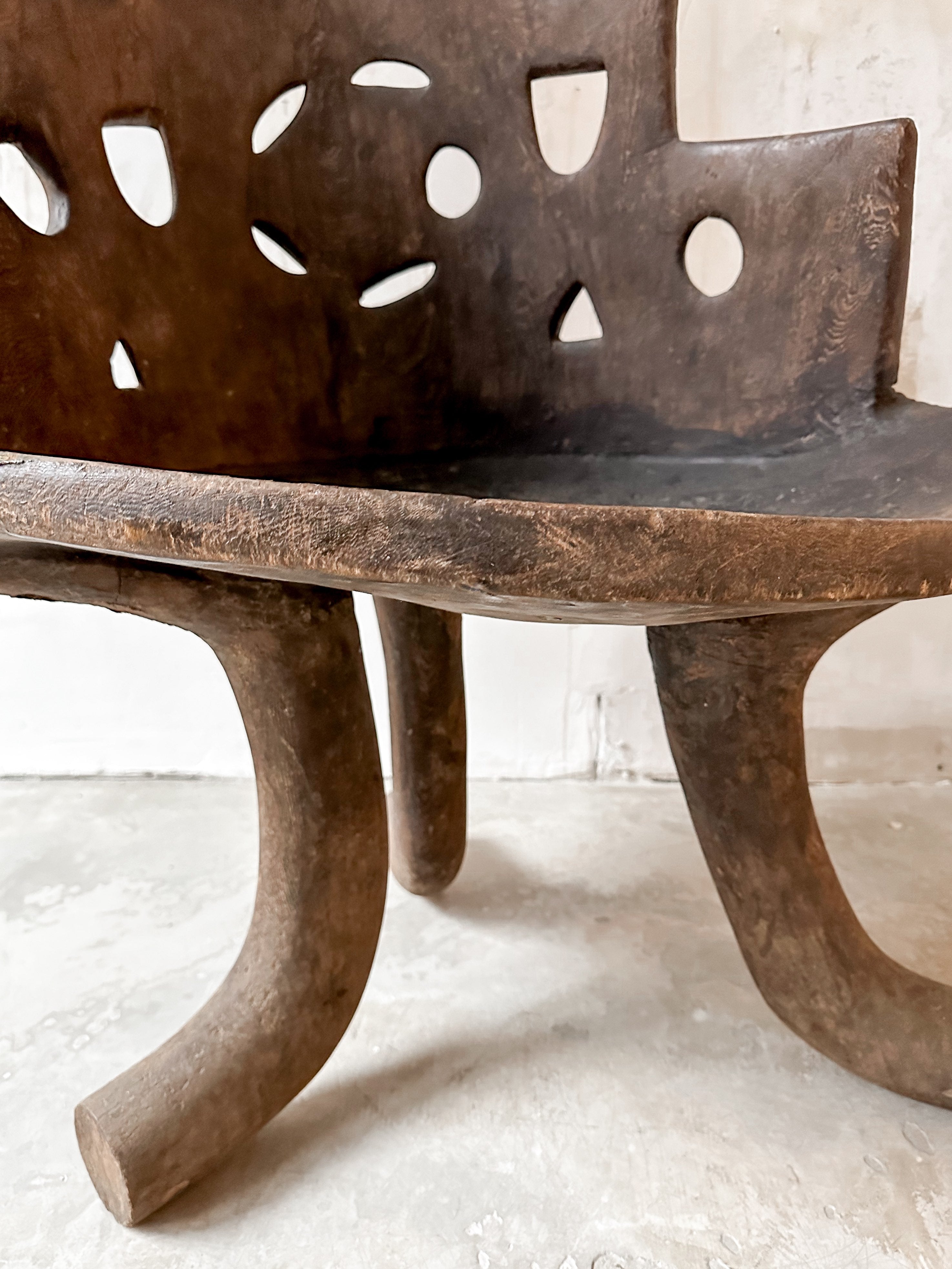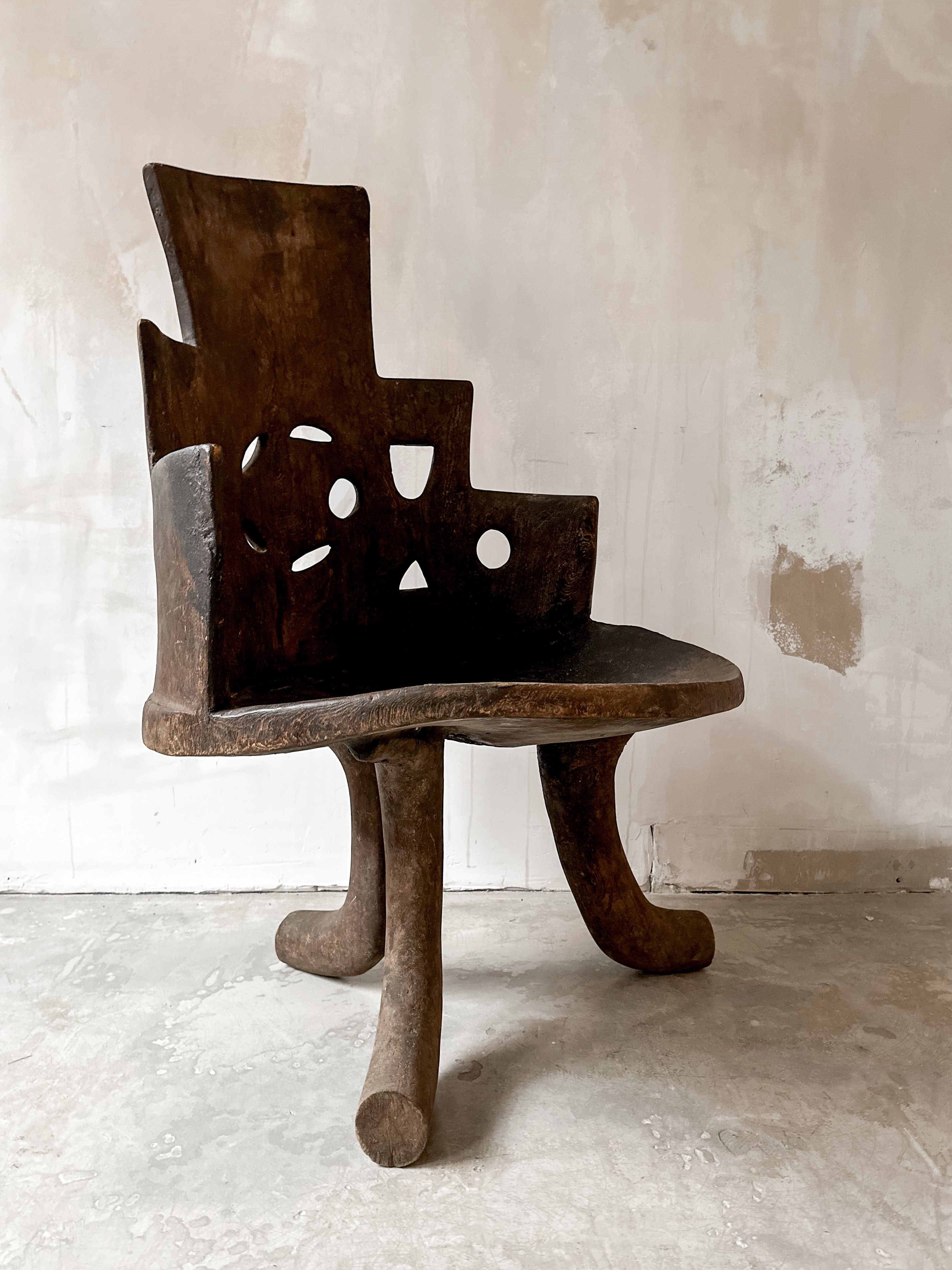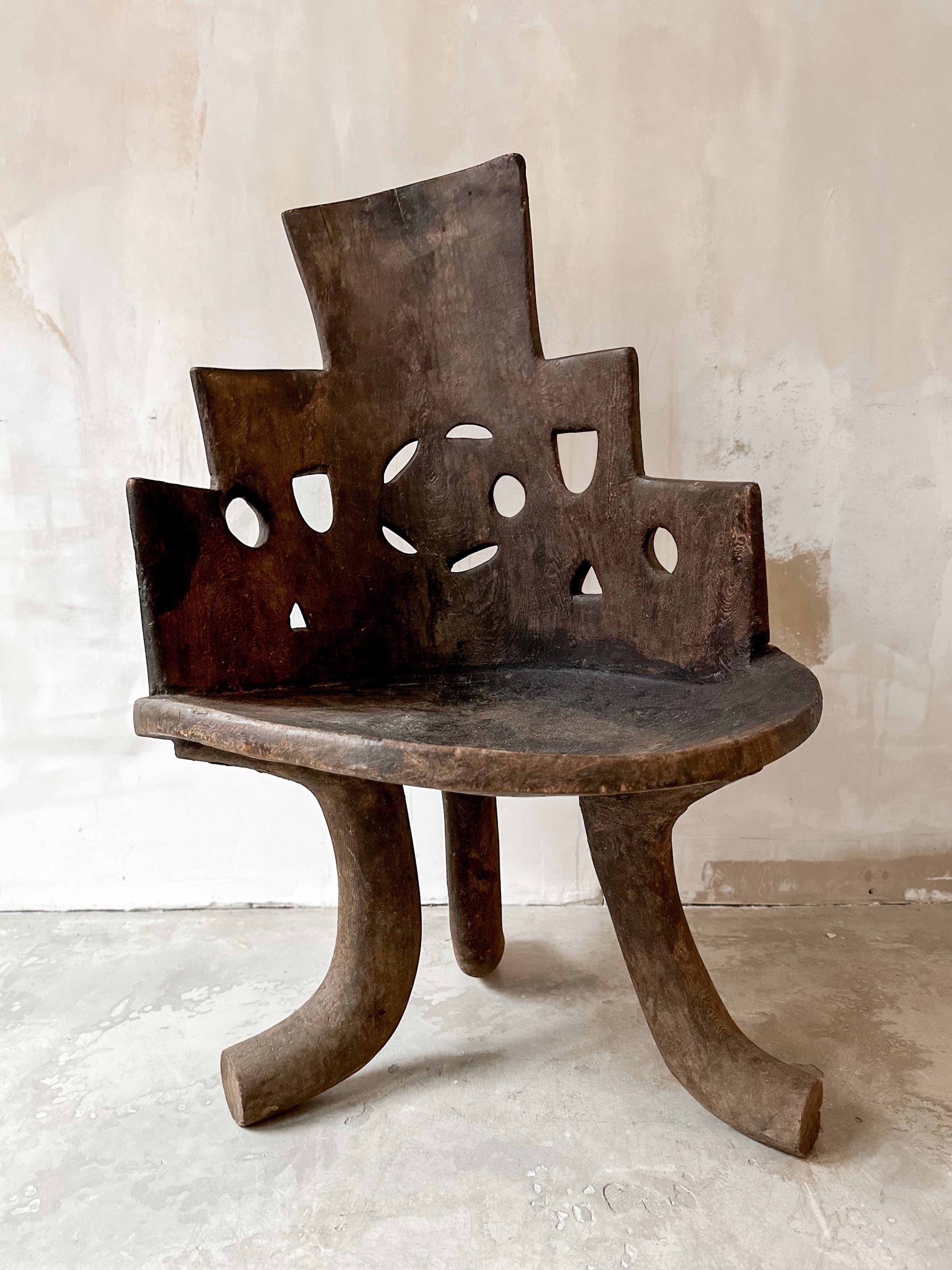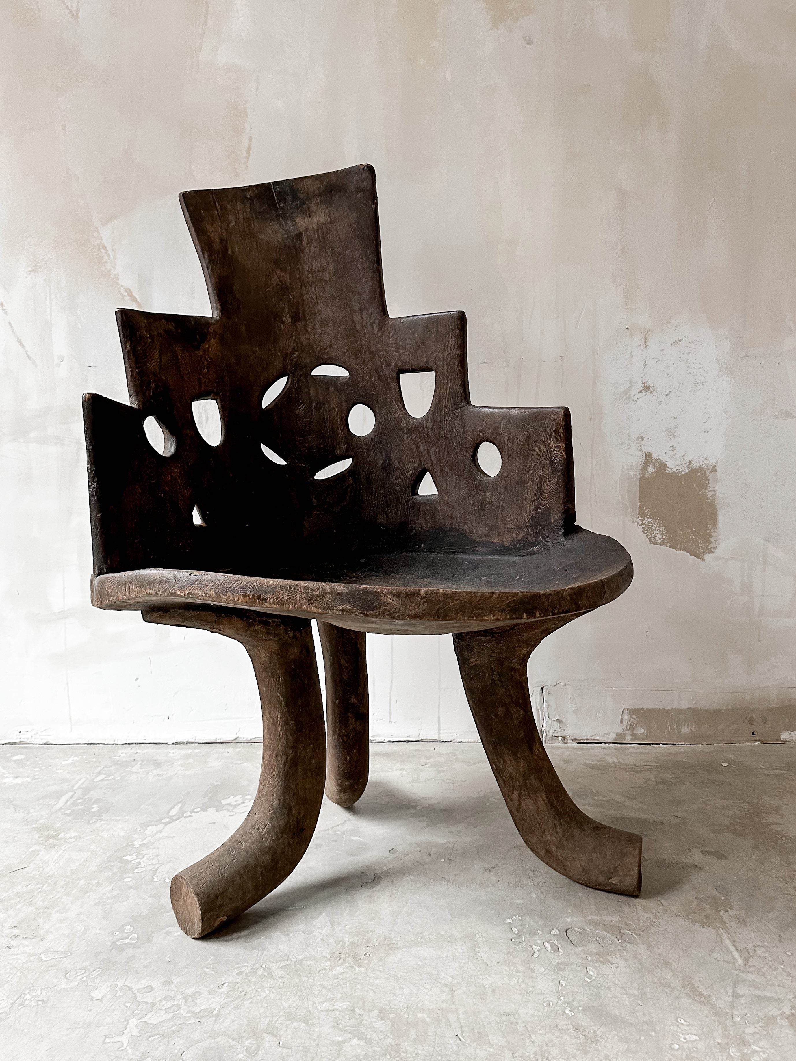Ein außergewöhnliches Exemplar aus Äthiopien. Der Stuhl wurde komplett aus einem Stück Holz handgeschnitzt und stammt aus dem letzten Jahrhundert. Früher wurden diese Stühle bei der Inthronisierung neuer Könige verwendet.
