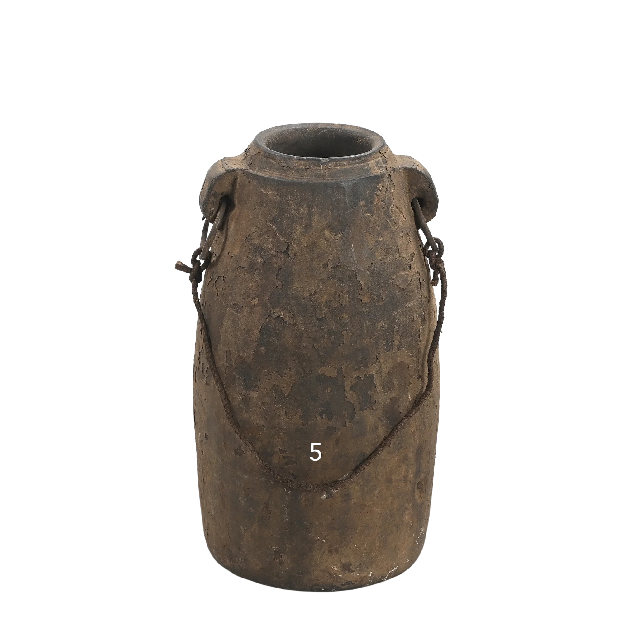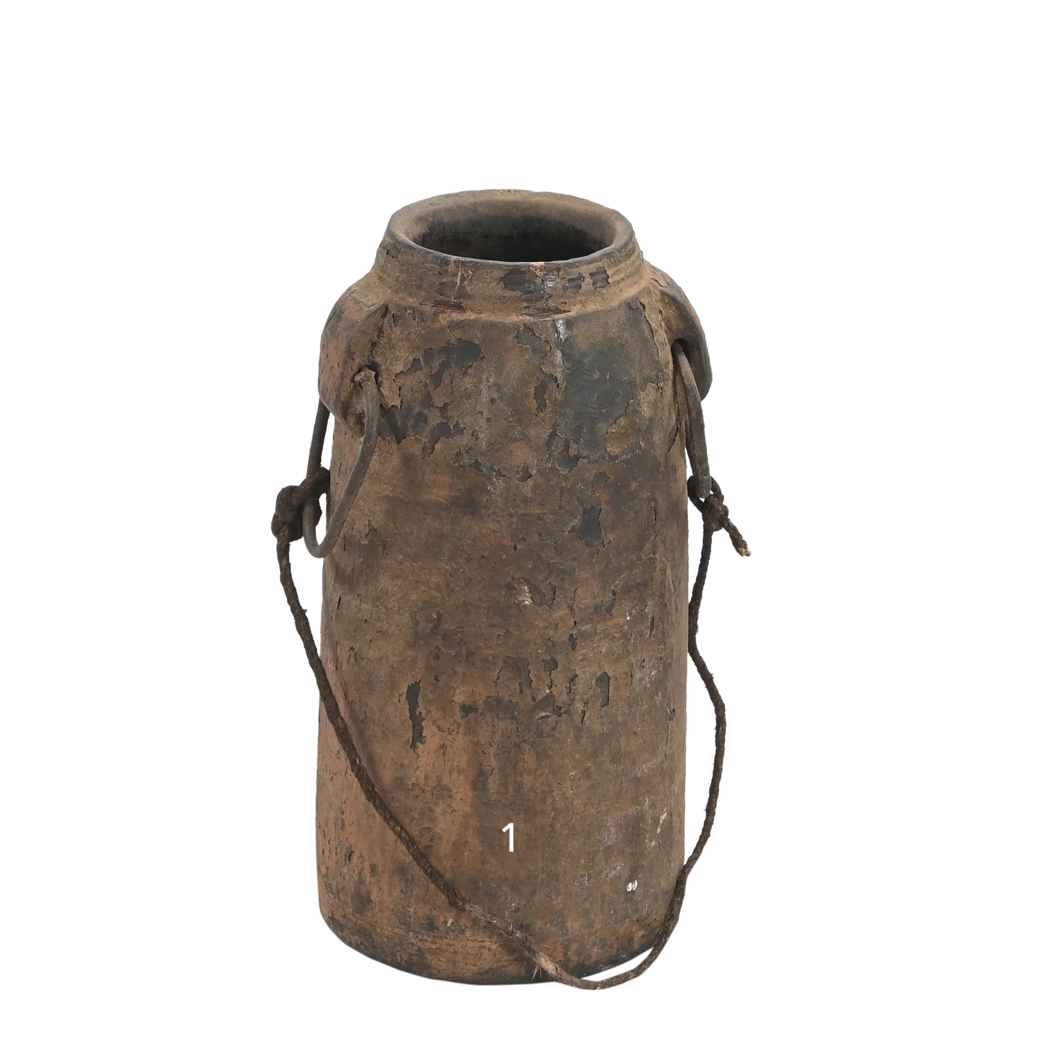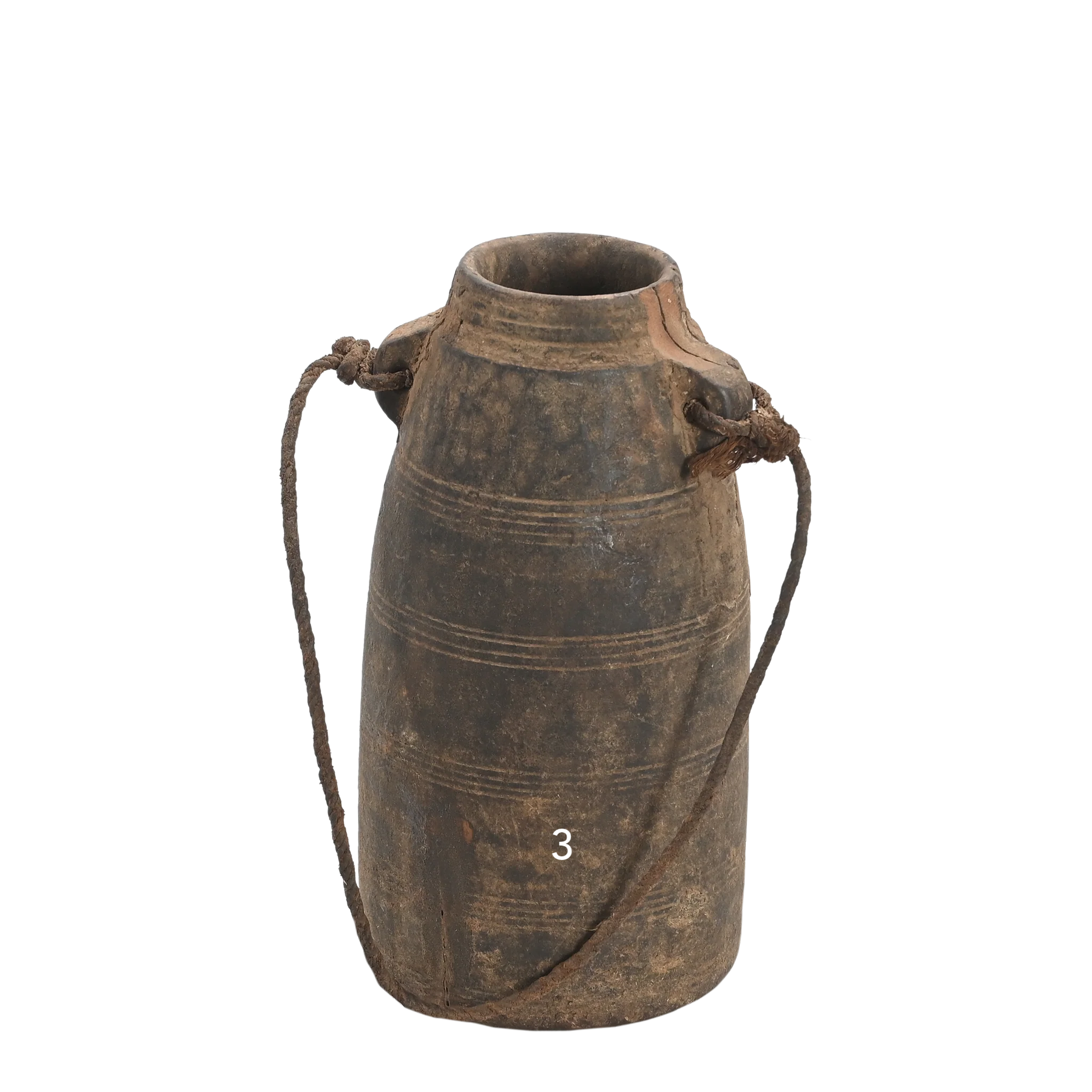 Diese alten Holzgefäße sind authentische Stücke aus Nordindien und dem Himalaya, wo diese Töpfe in religiösen Zeremonien oder Ritualen verwendet wurden. Durch die Lagerung von Milch oder Butter haben sie ihre so charakteristische dunkle Patina erhalten.