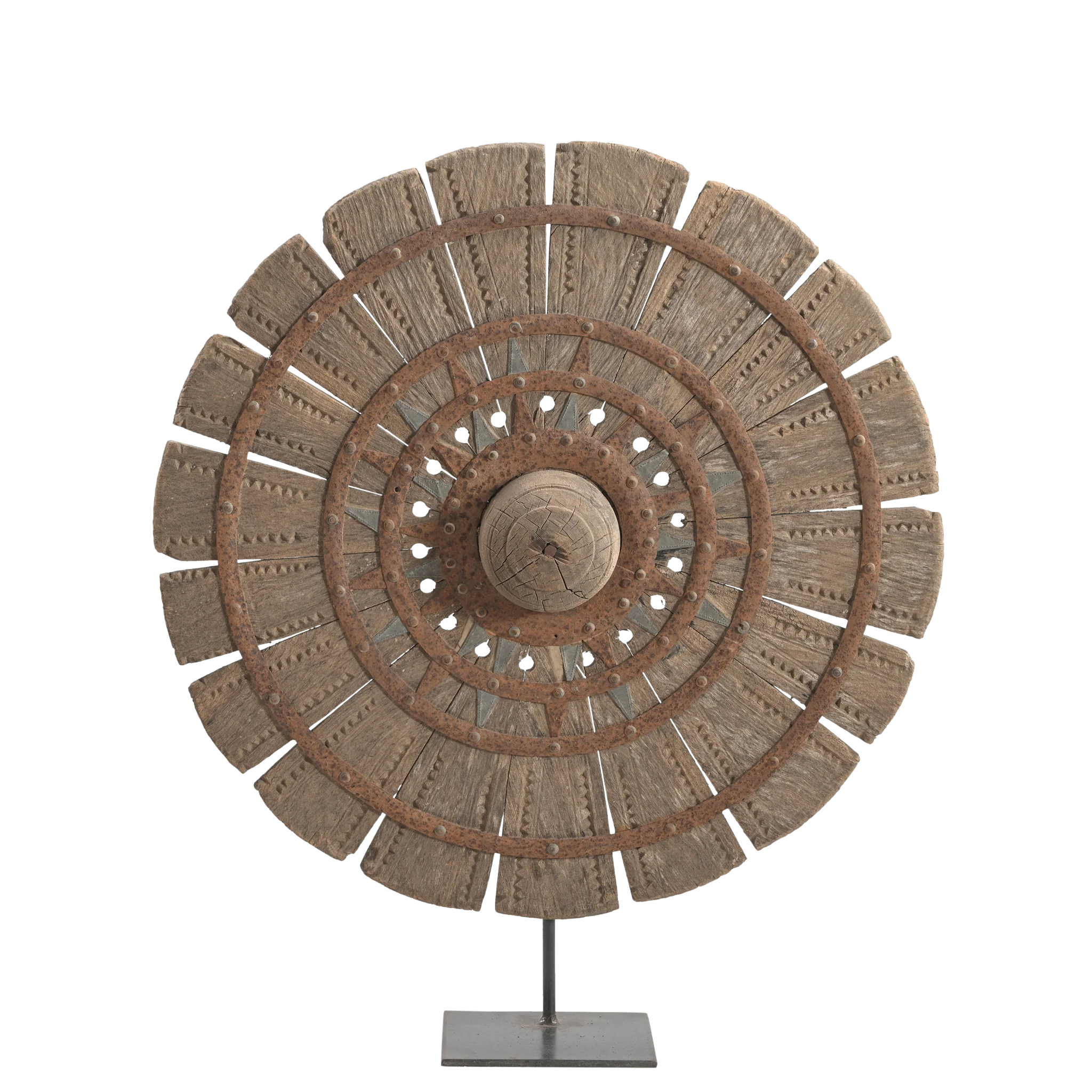 Ein wunderschönes Dekorationsstück ist dieses Teil eines einstigen hölzernen Charkha Spinnrads, montiert auf einem Ständer. Das Rad diente zum Spinnen von Baumwollfasern.