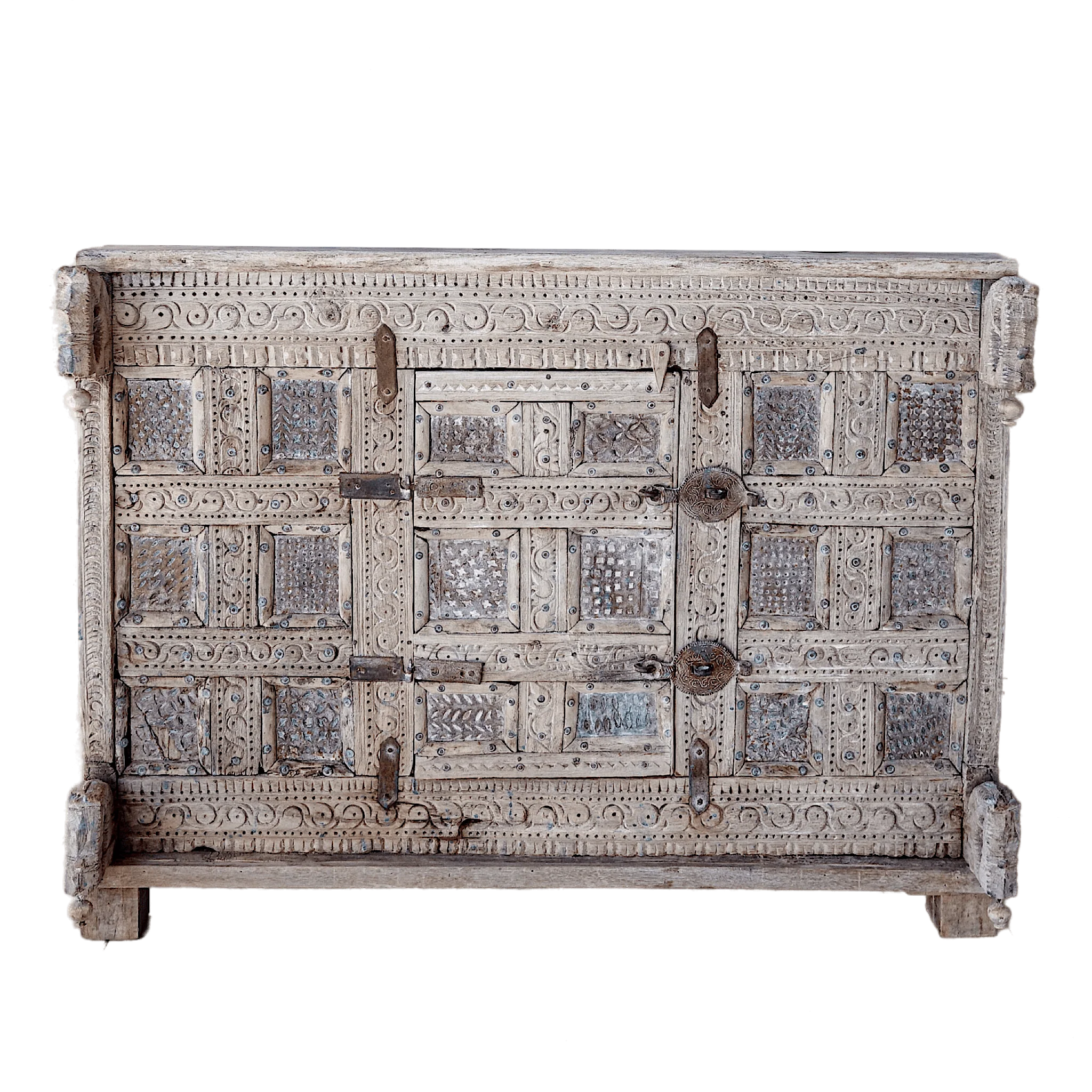 Traditionell sind diese Sideboards in leuchtenden Farben bemalt. Dieses Exemplar wurde abgeschliffen und dann gebleicht, um eine schöne moderne Optik zu erschaffen. Die Schatztruhe verfügt über mehrere kleine Türchen und zahlreiche, liebevolle Details im Holz und in den Griffen. Ein echtes Schmuckstück!