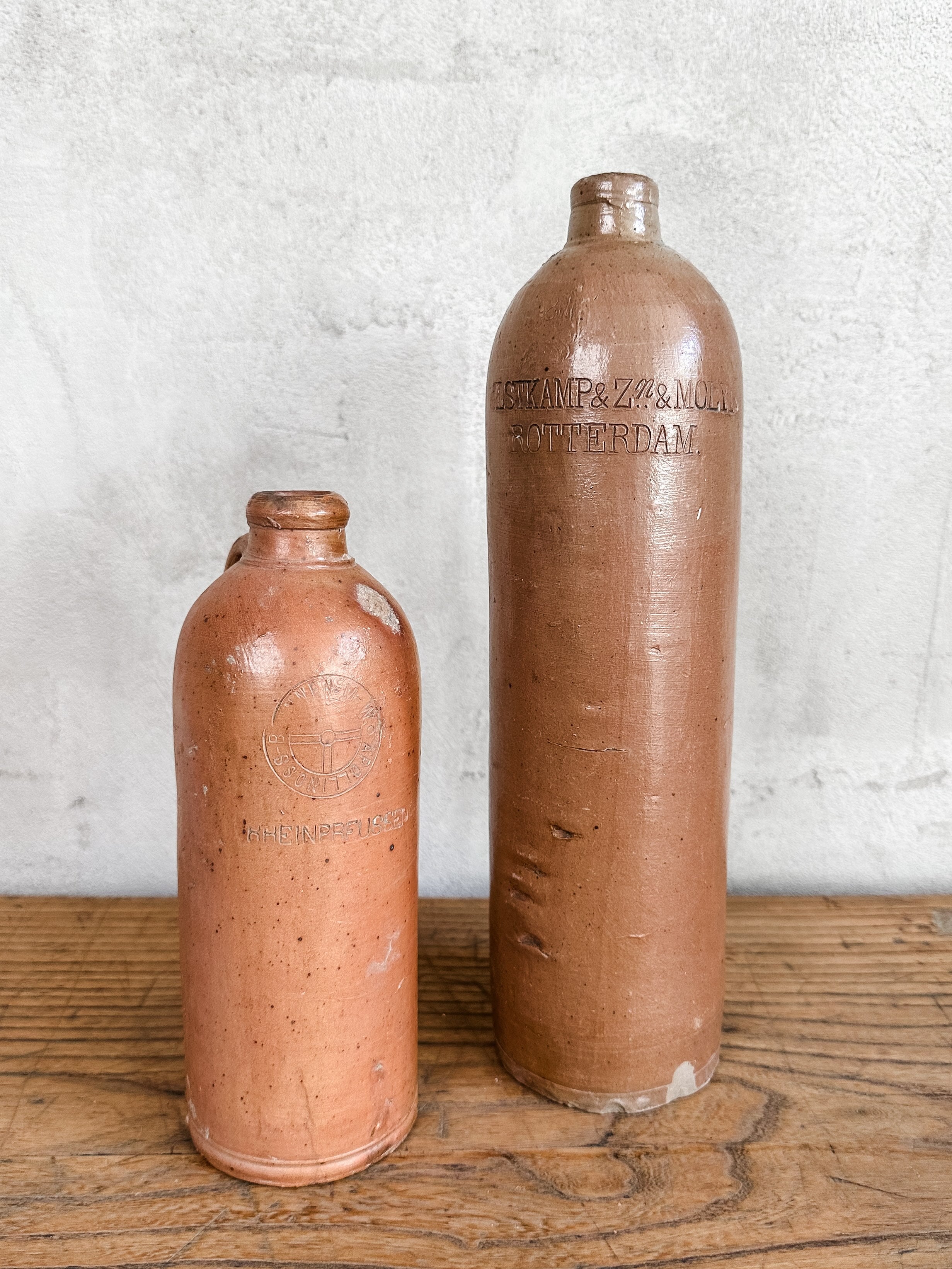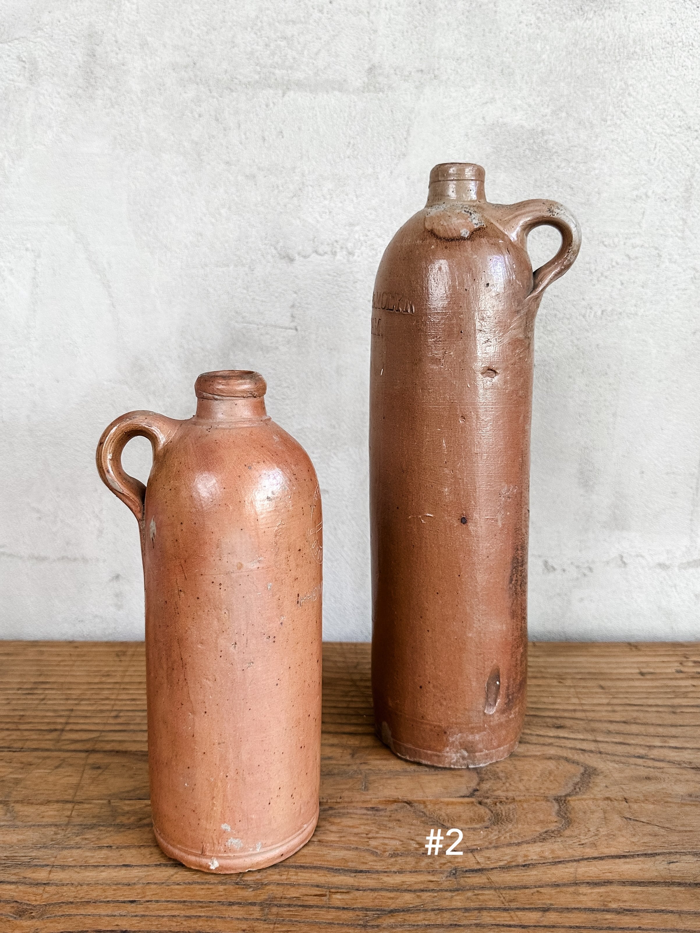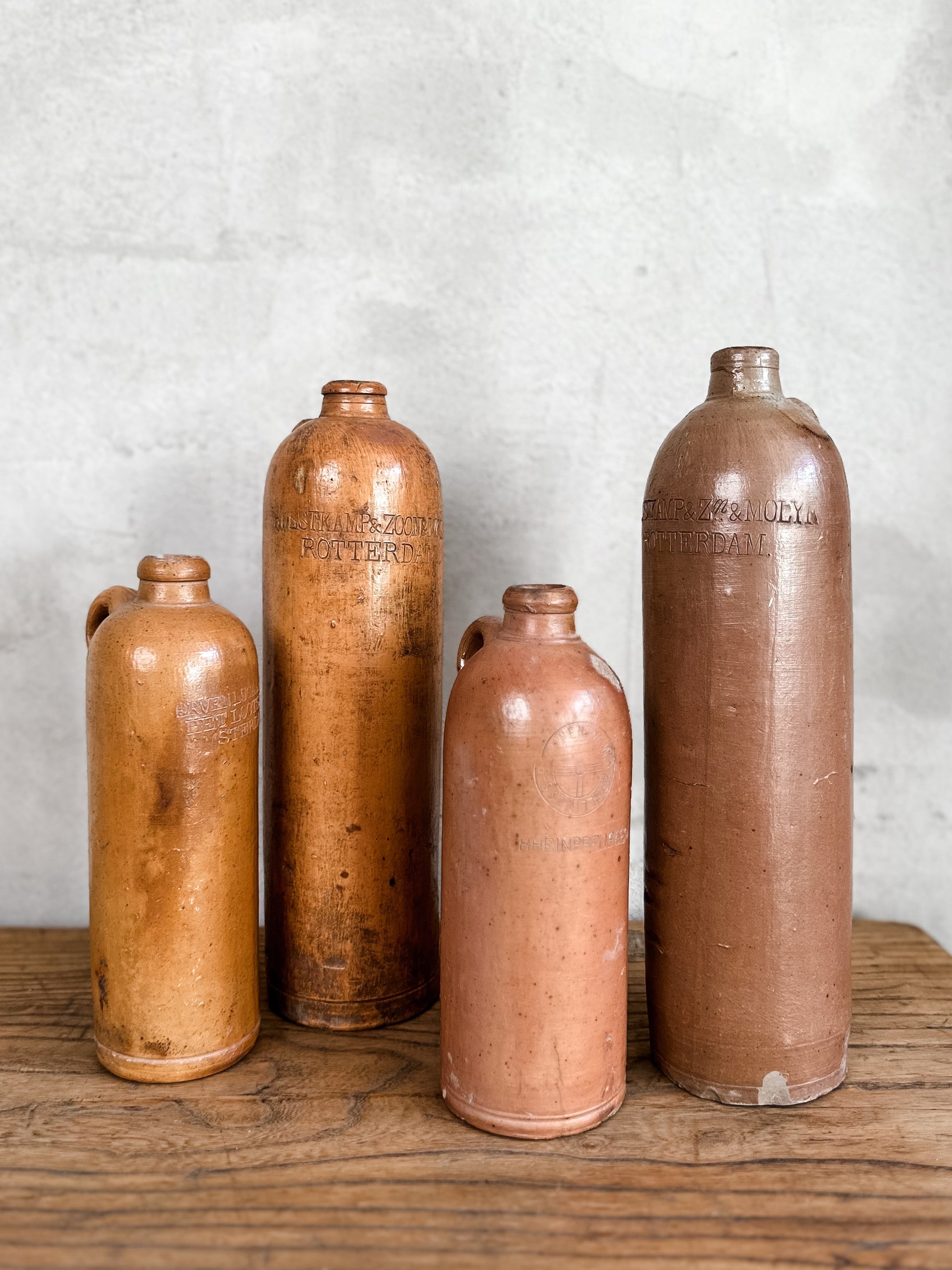 Terrakotta-farbene Flaschen aus der indonesischen Kolonialzeit. Die Flaschen wurden in einem Fluss auf Sumatra gefunden. Das Wasser und die Sedimente haben einzigartige Spuren auf den Flaschen hinterlassen.