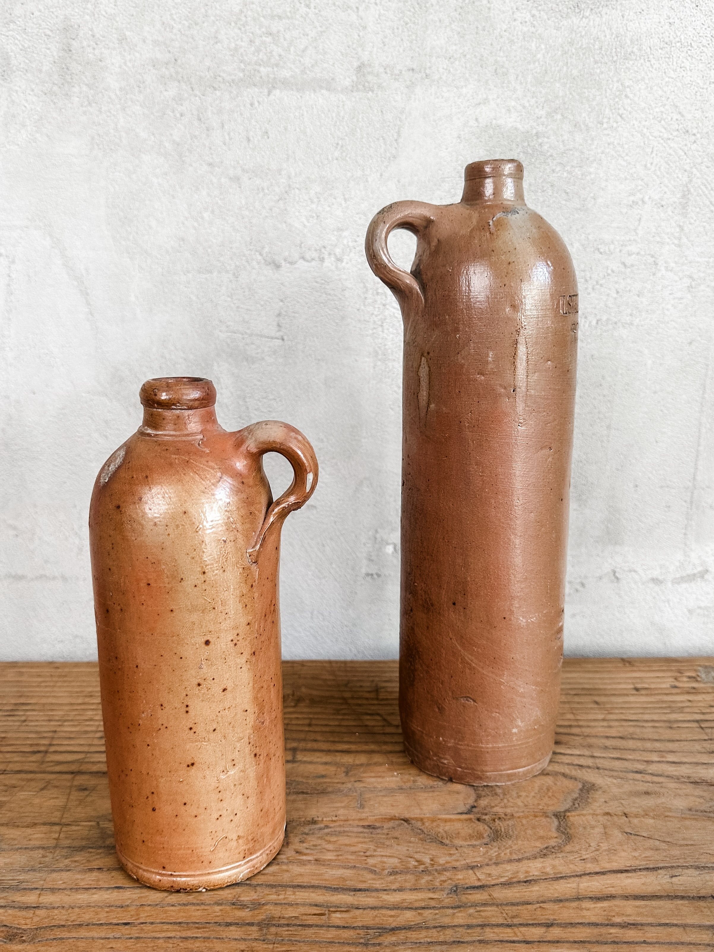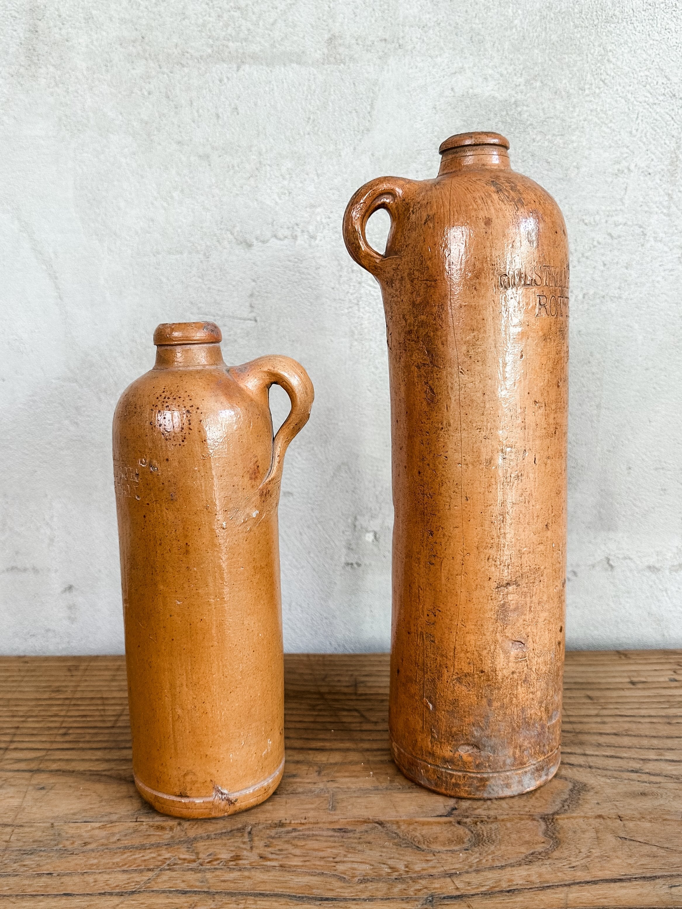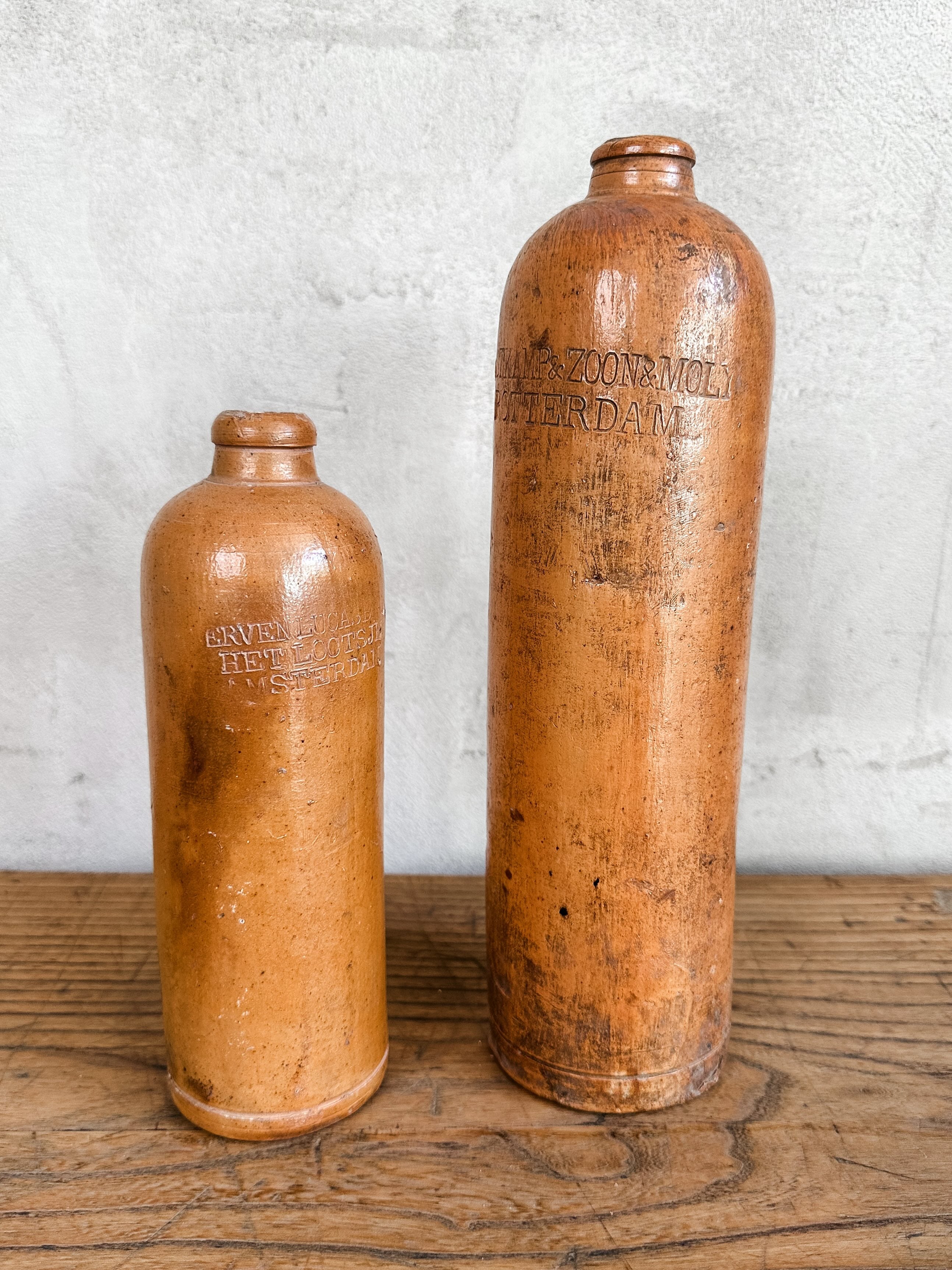 Terrakotta-farbene Flaschen aus der indonesischen Kolonialzeit. Die Flaschen wurden in einem Fluss auf Sumatra gefunden. Das Wasser und die Sedimente haben einzigartige Spuren auf den Flaschen hinterlassen.