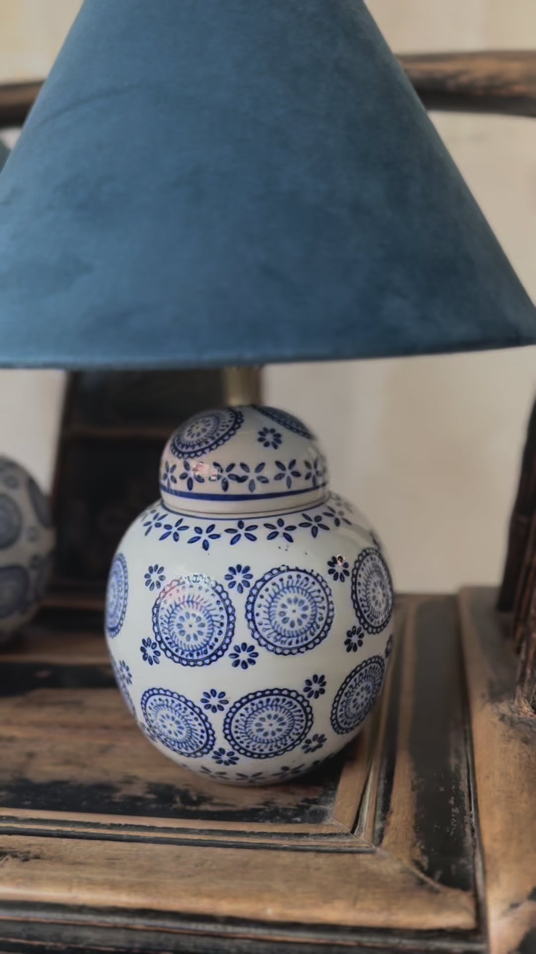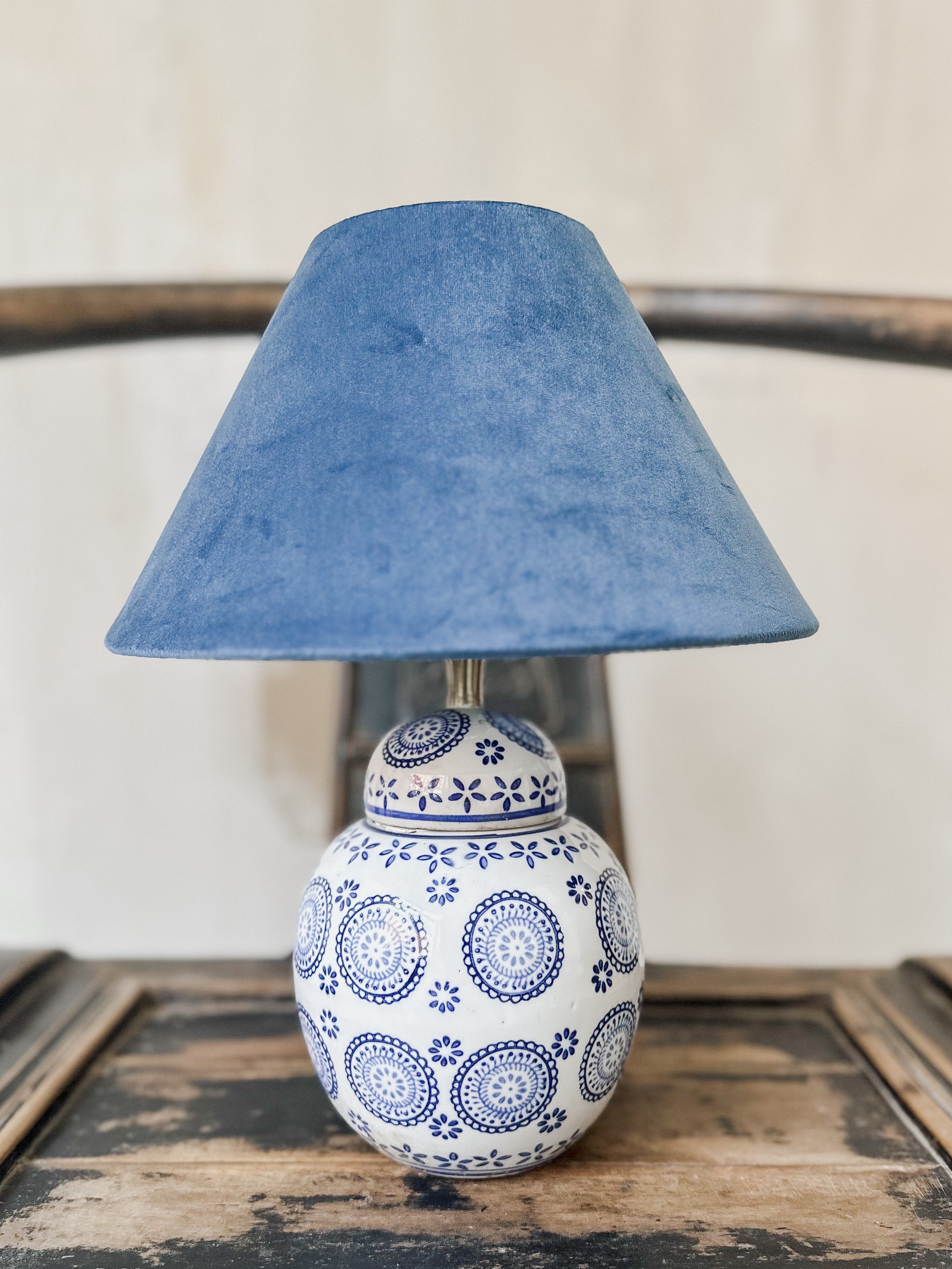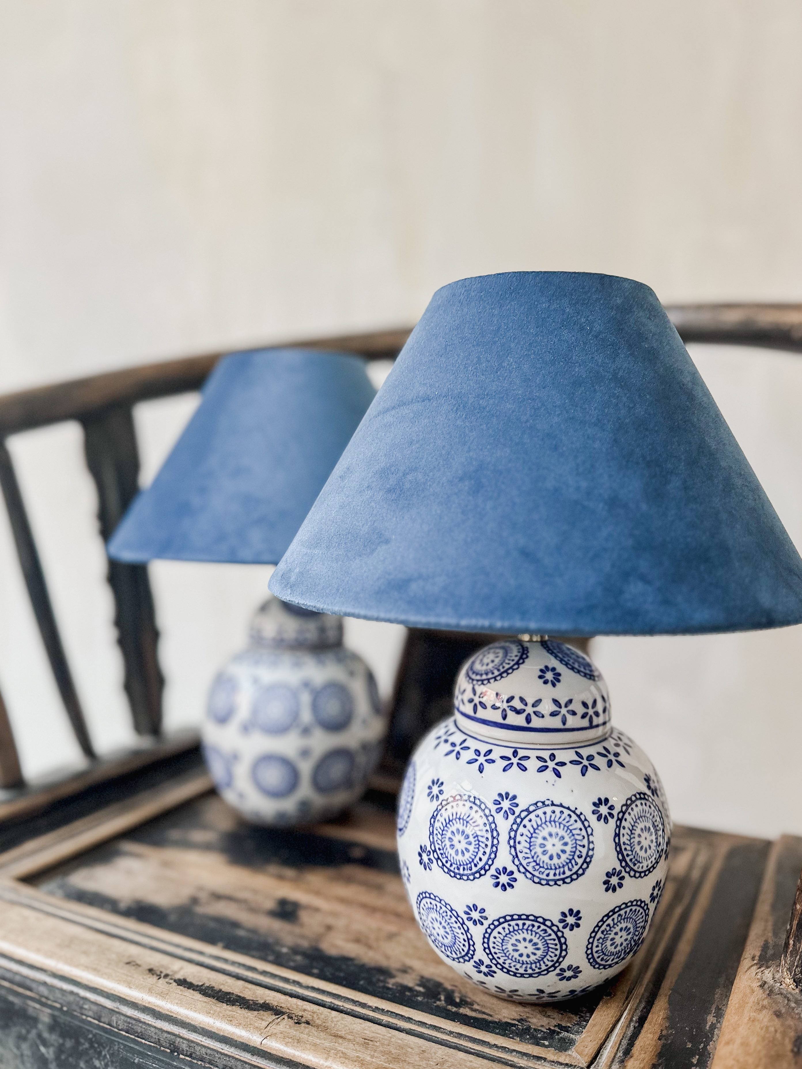 Bezauberndes Tischlampen-Duo: Der Lampenfuß ist aus jeweils aus einer Porzellandose mit Deckel gefertigt, der Lampenschirm aus blauem Samt.