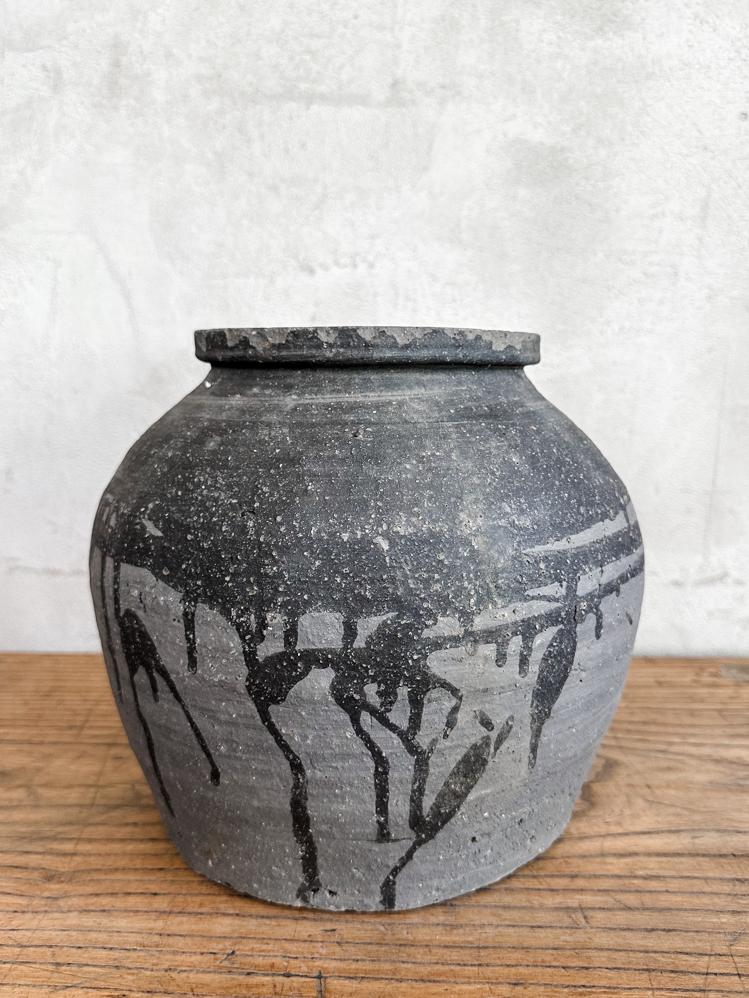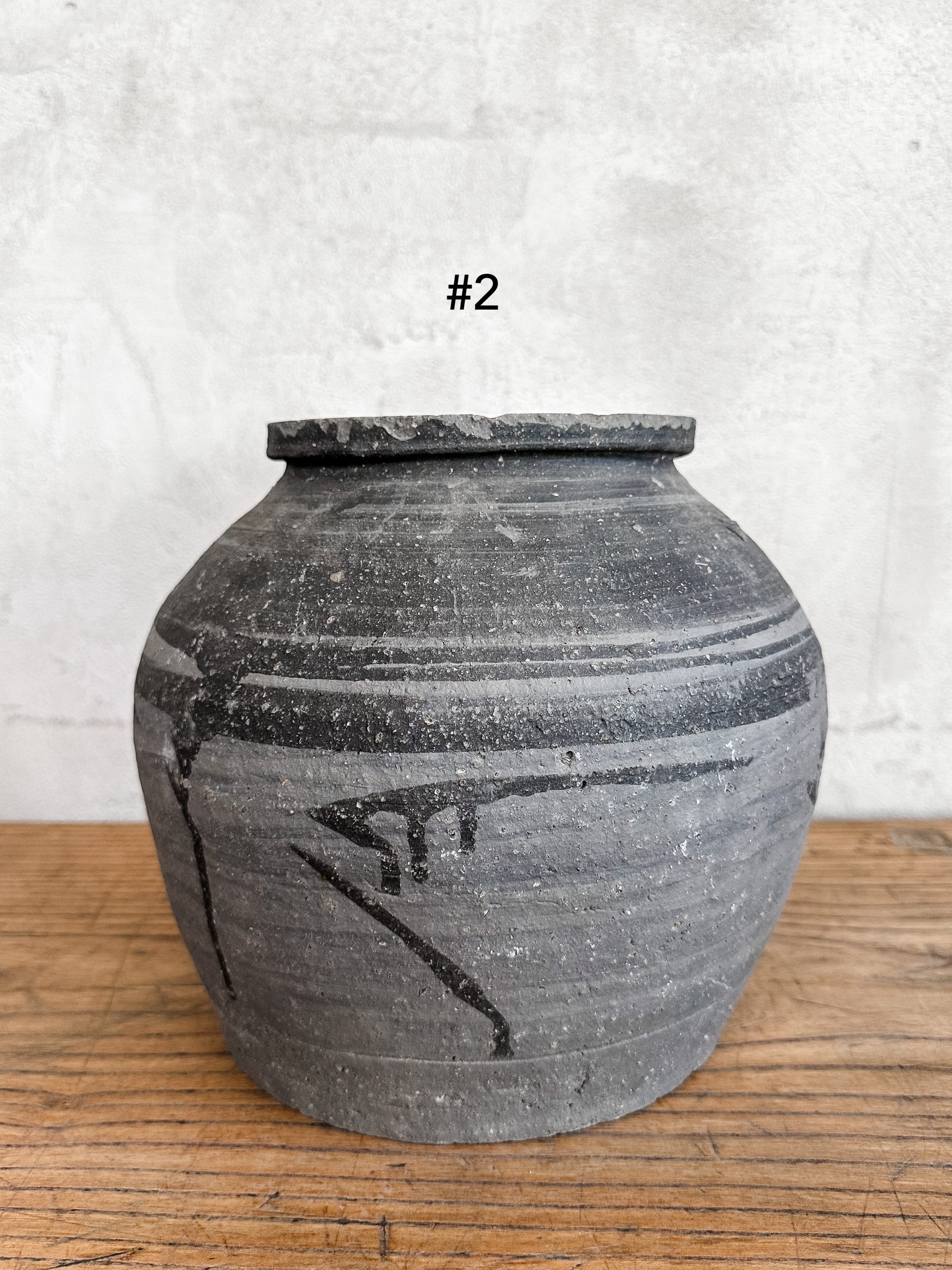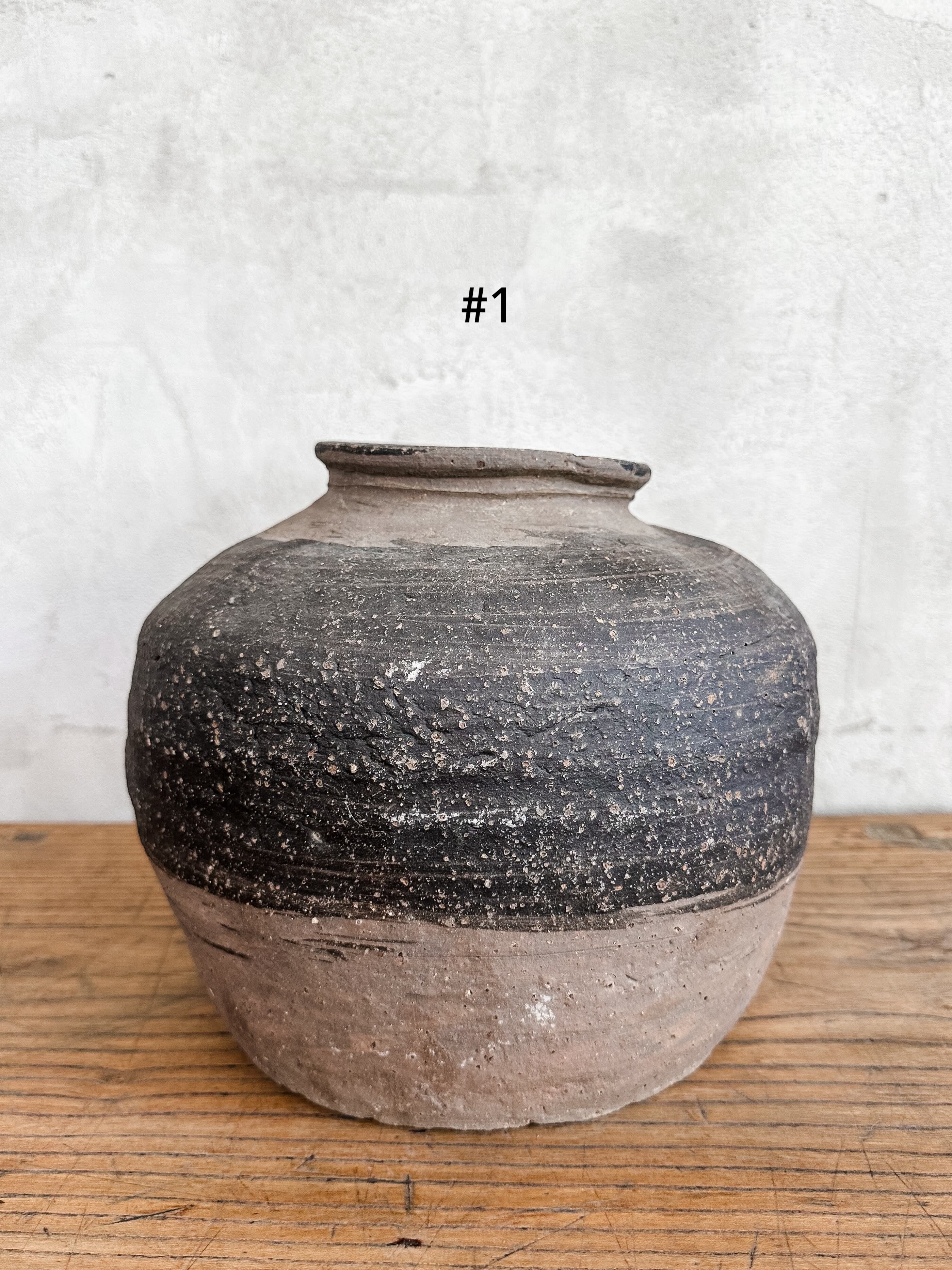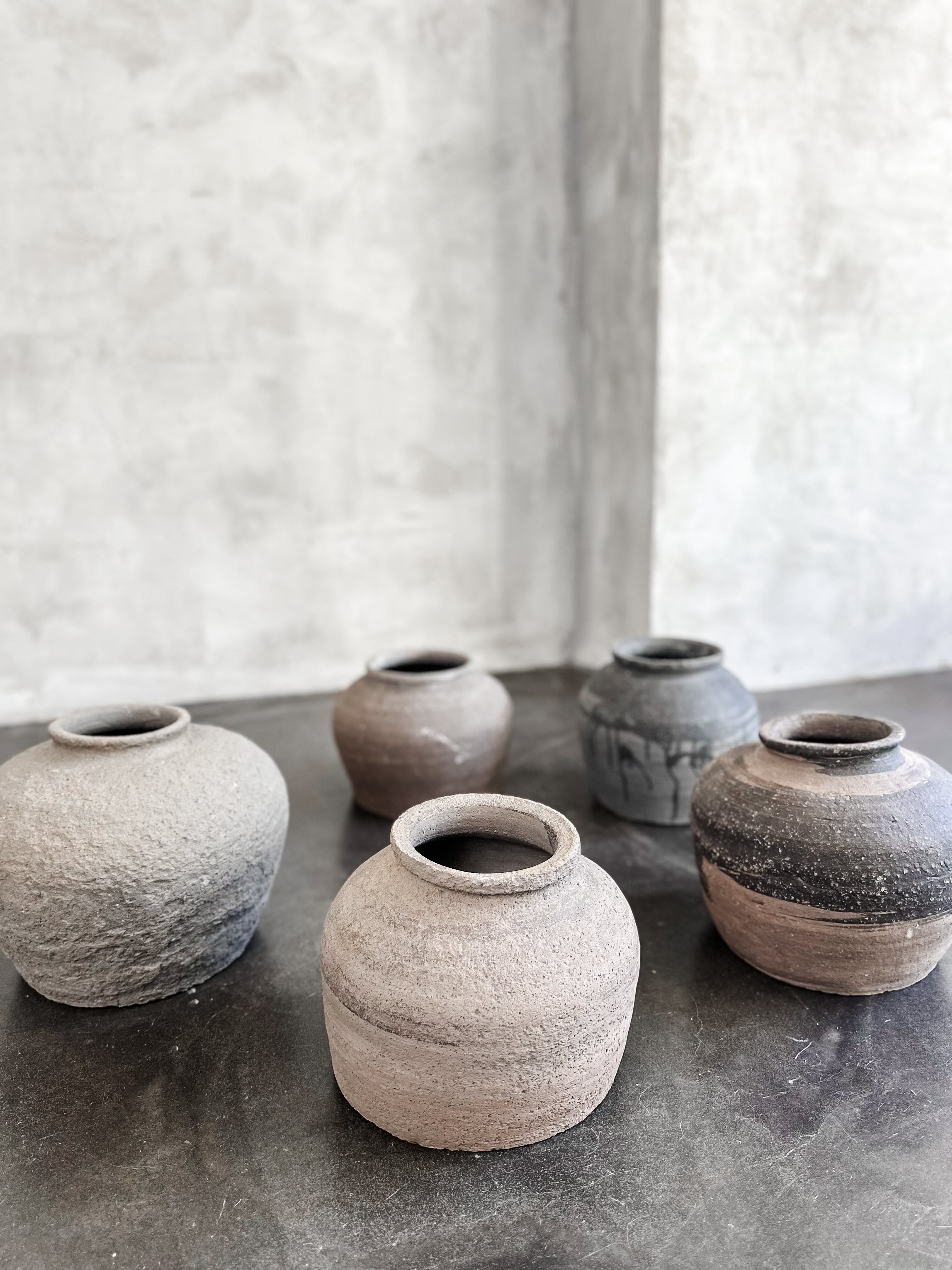 Alte Töpfe aus rauem Steinzeug mit flachem Boden. Schwer und stabil. Über die Jahre hat sich eine wundervolle Patina entwickelt.