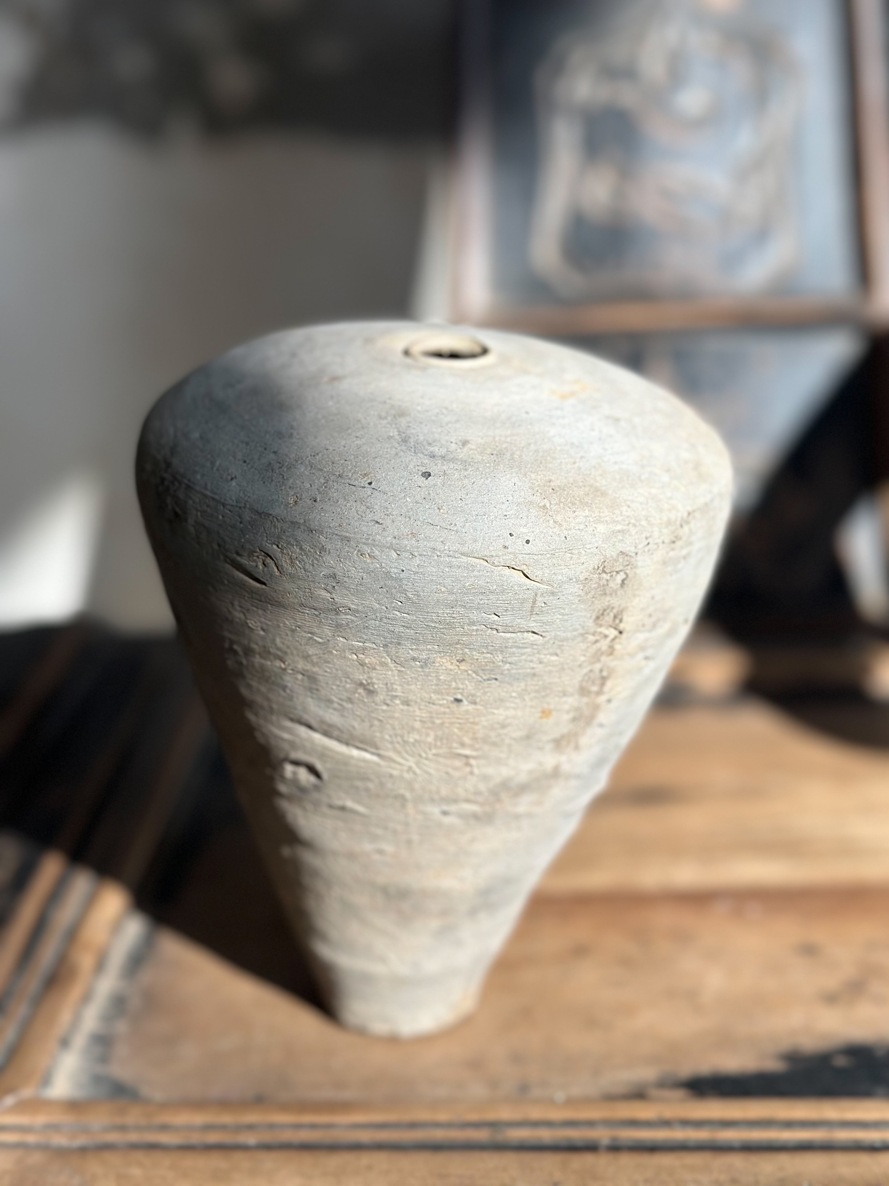Diese wundervolle imperfekte Flasche ist unglasiert und wurde wahrscheinlich als Behälter für Wasser oder Alkohol verwendet. Mit sehr kleiner Öffnung.