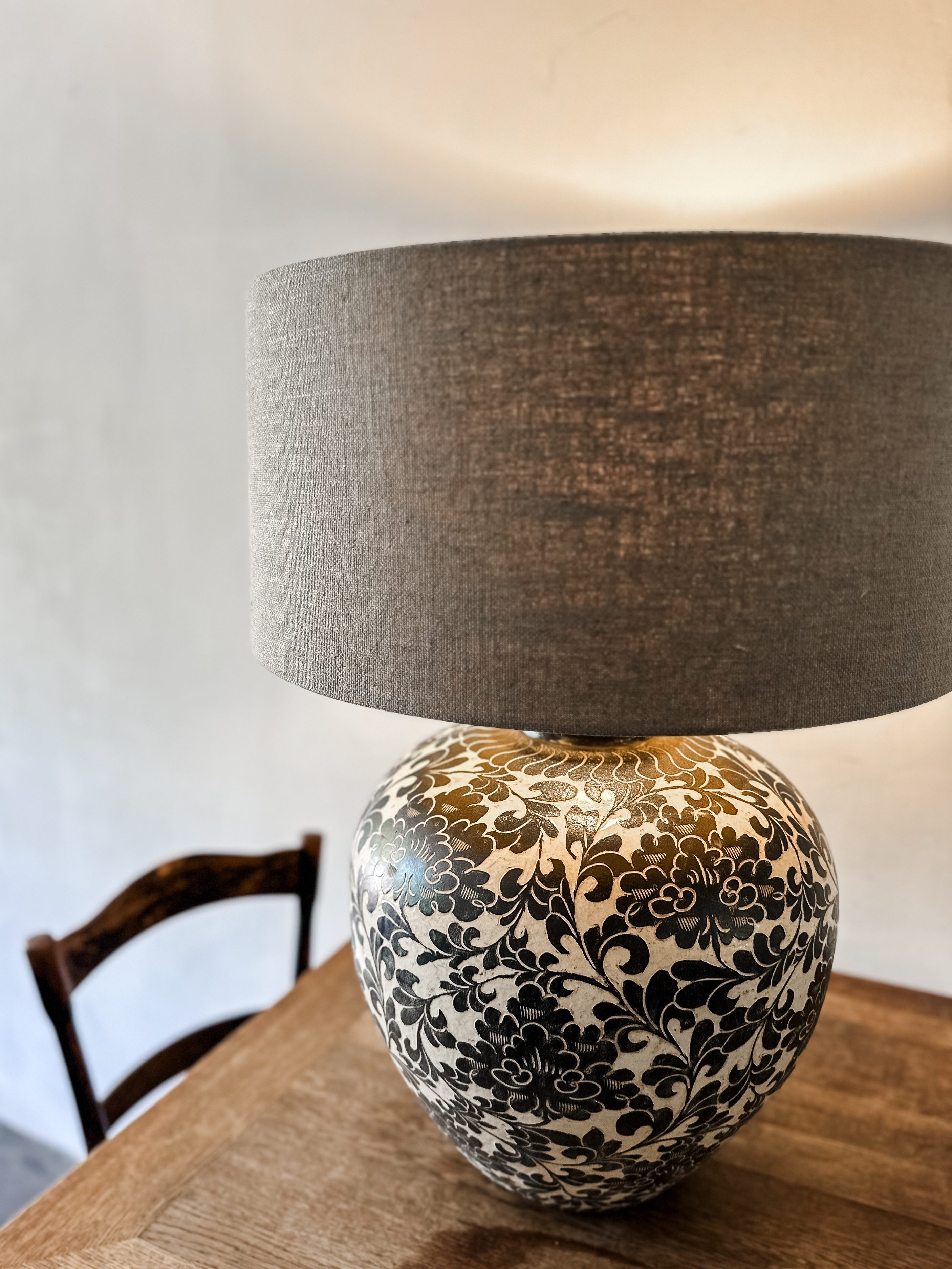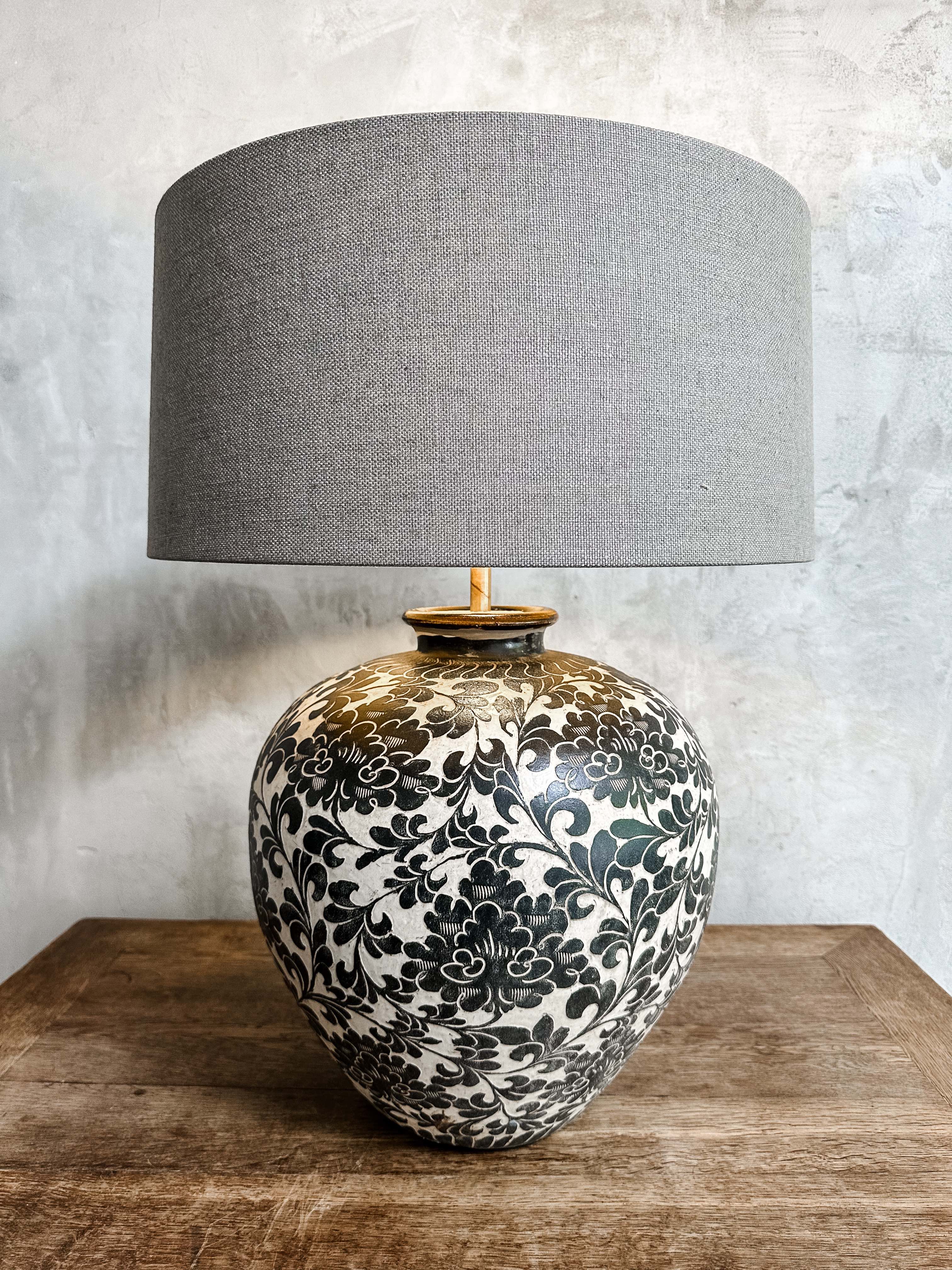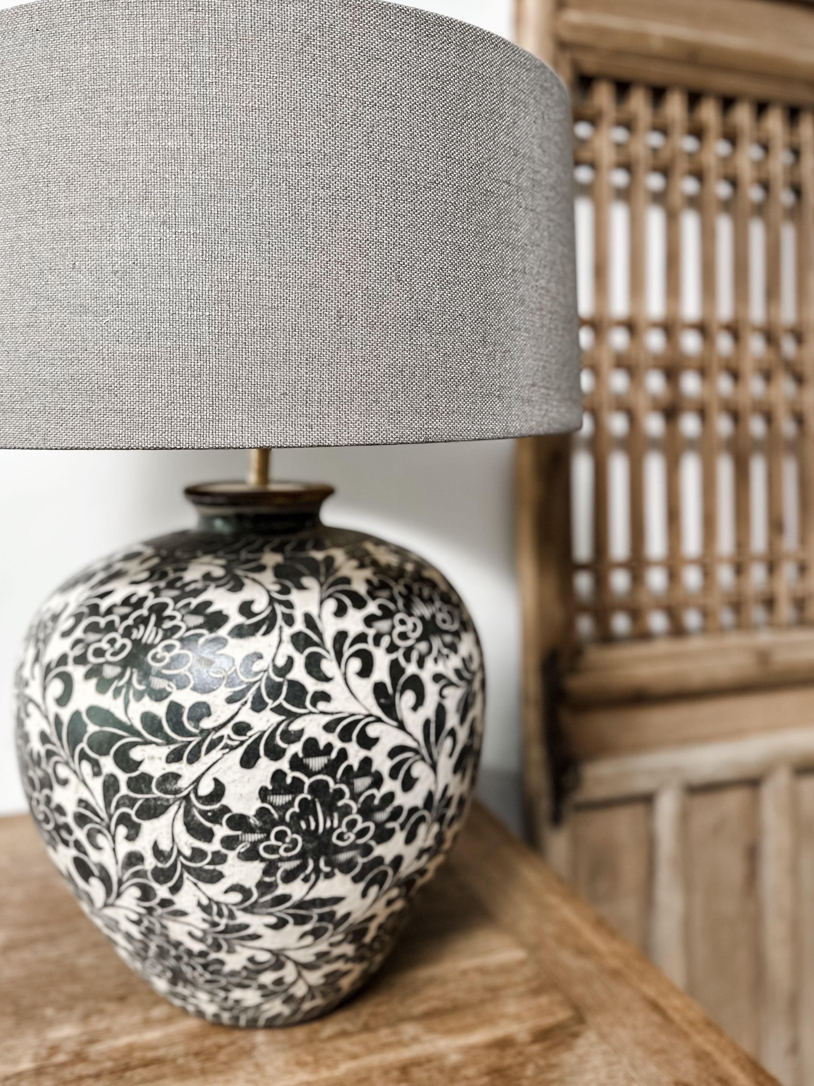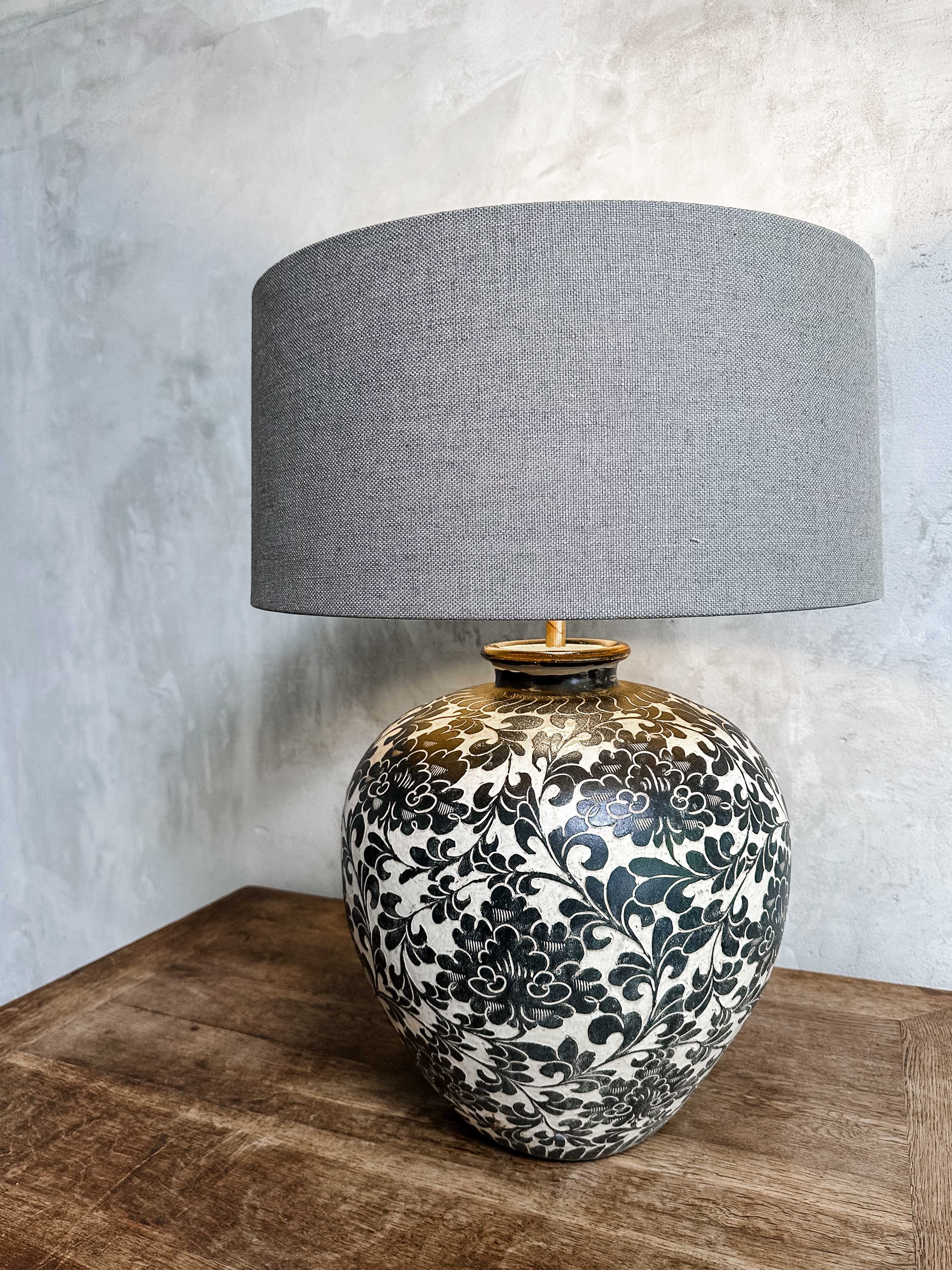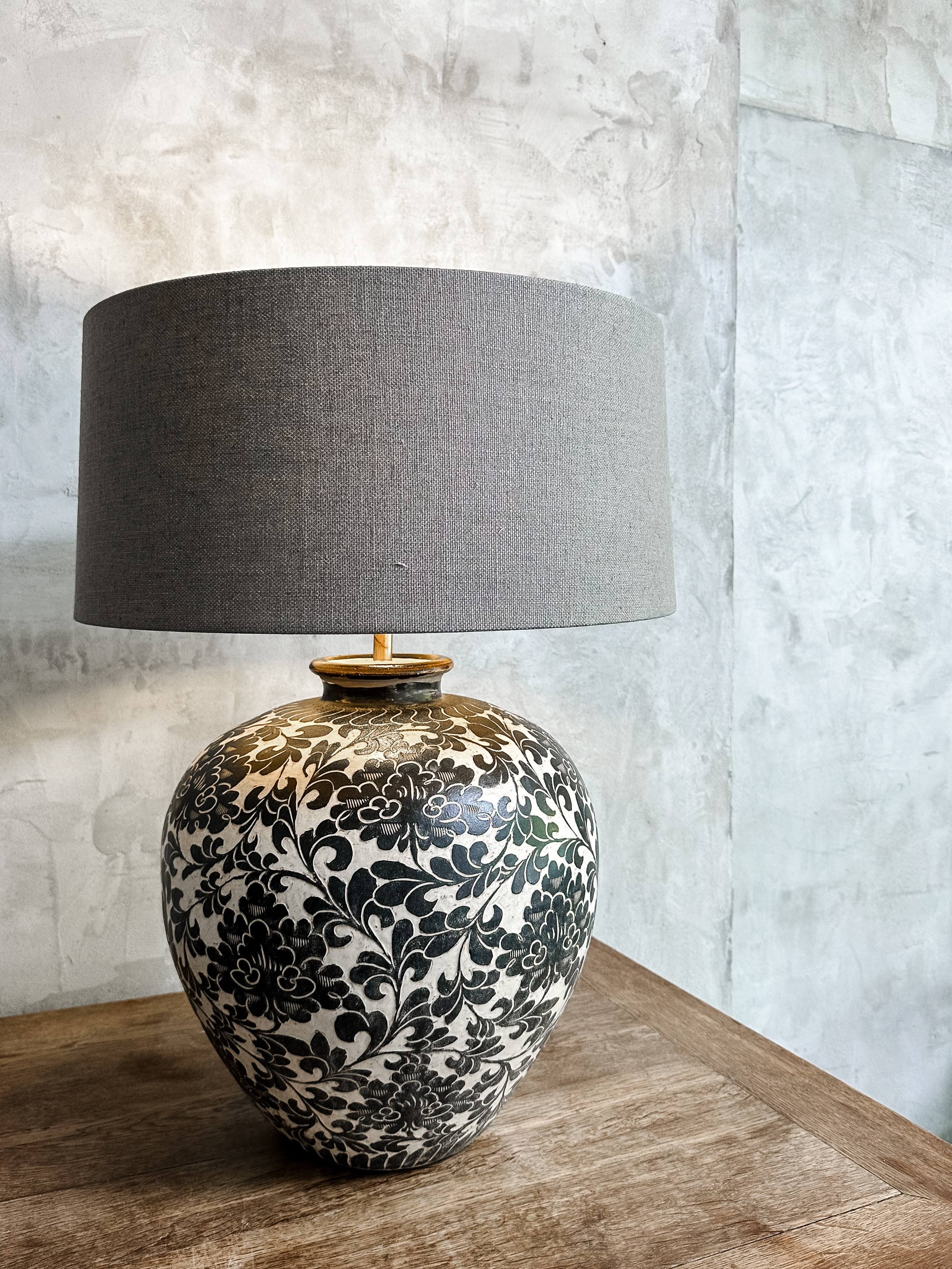 Diese Tischlampe kombiniert eine traditionelle chinesische Vase mit einem modernen Lampenschirm und ist so ein absolutes Einzelstück. Sie verleiht jedem Raum einen Hauch von Eleganz und Geschichte.