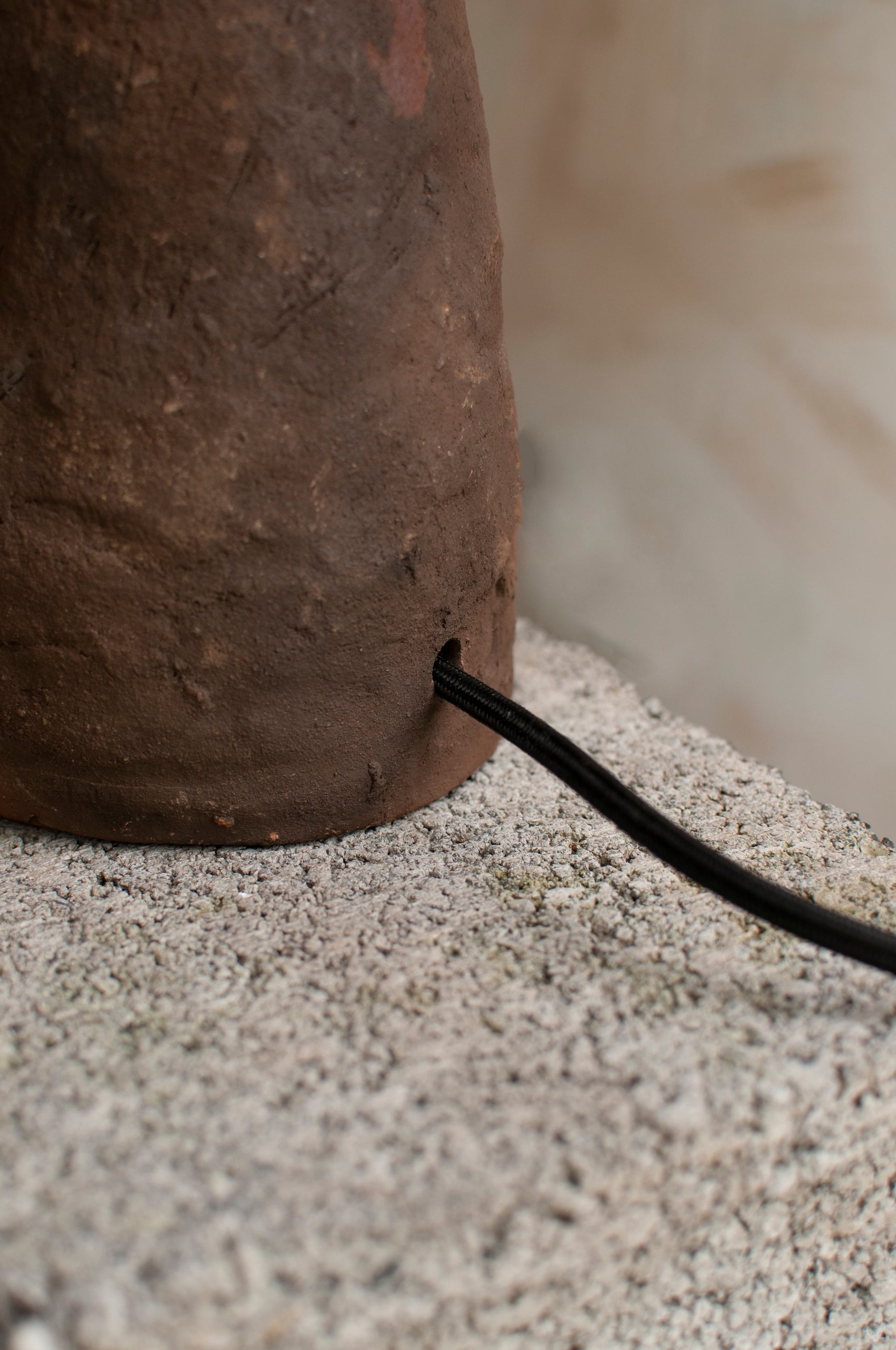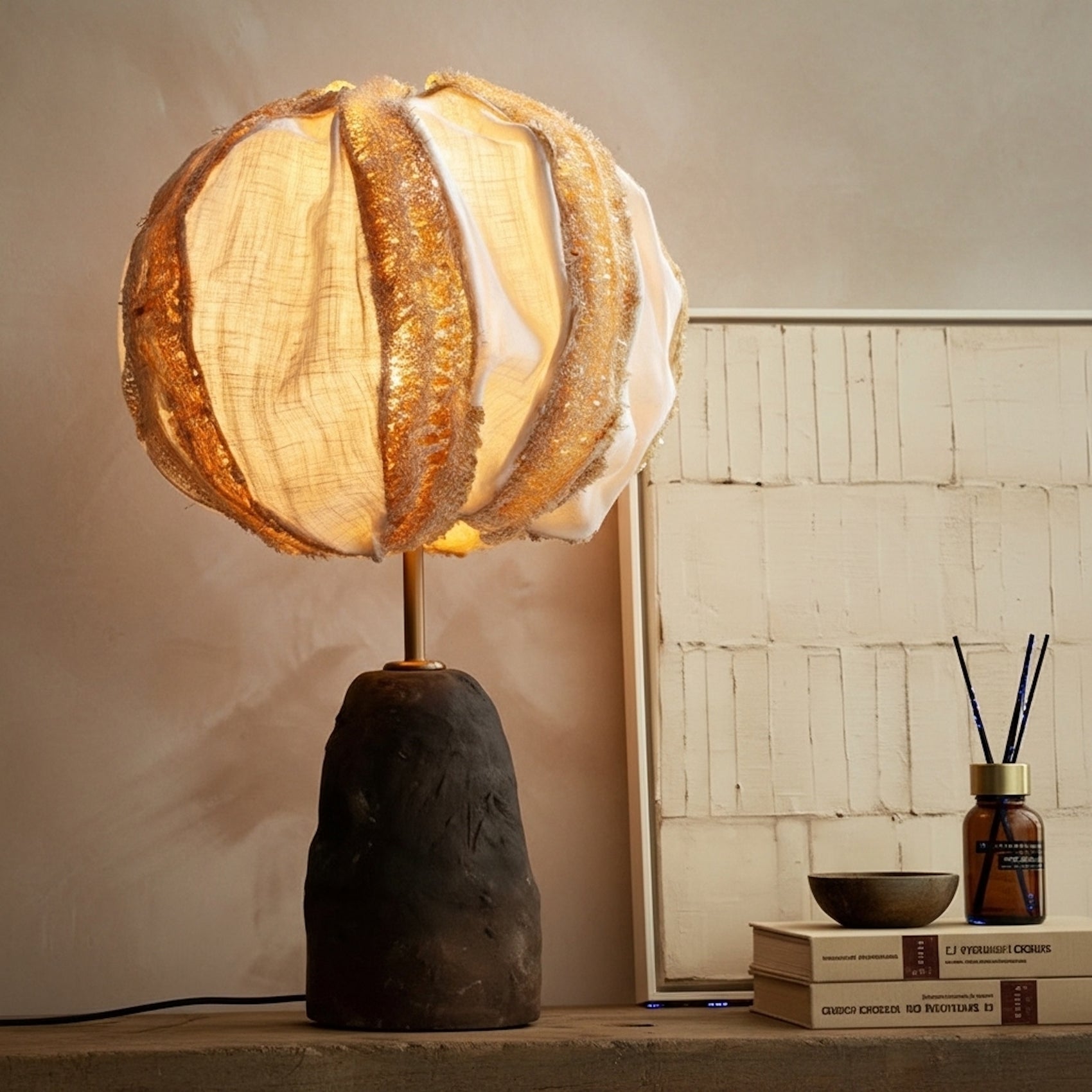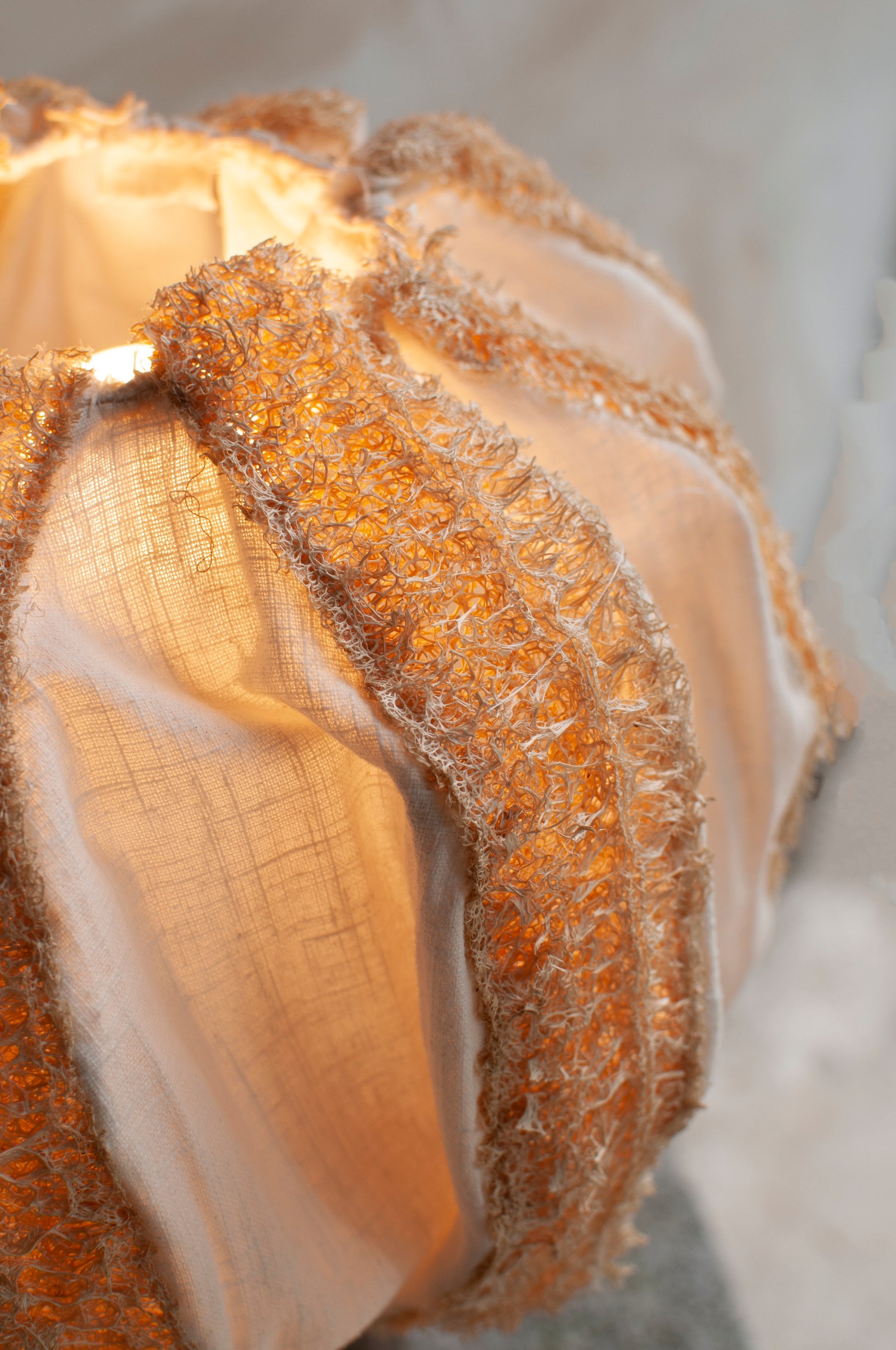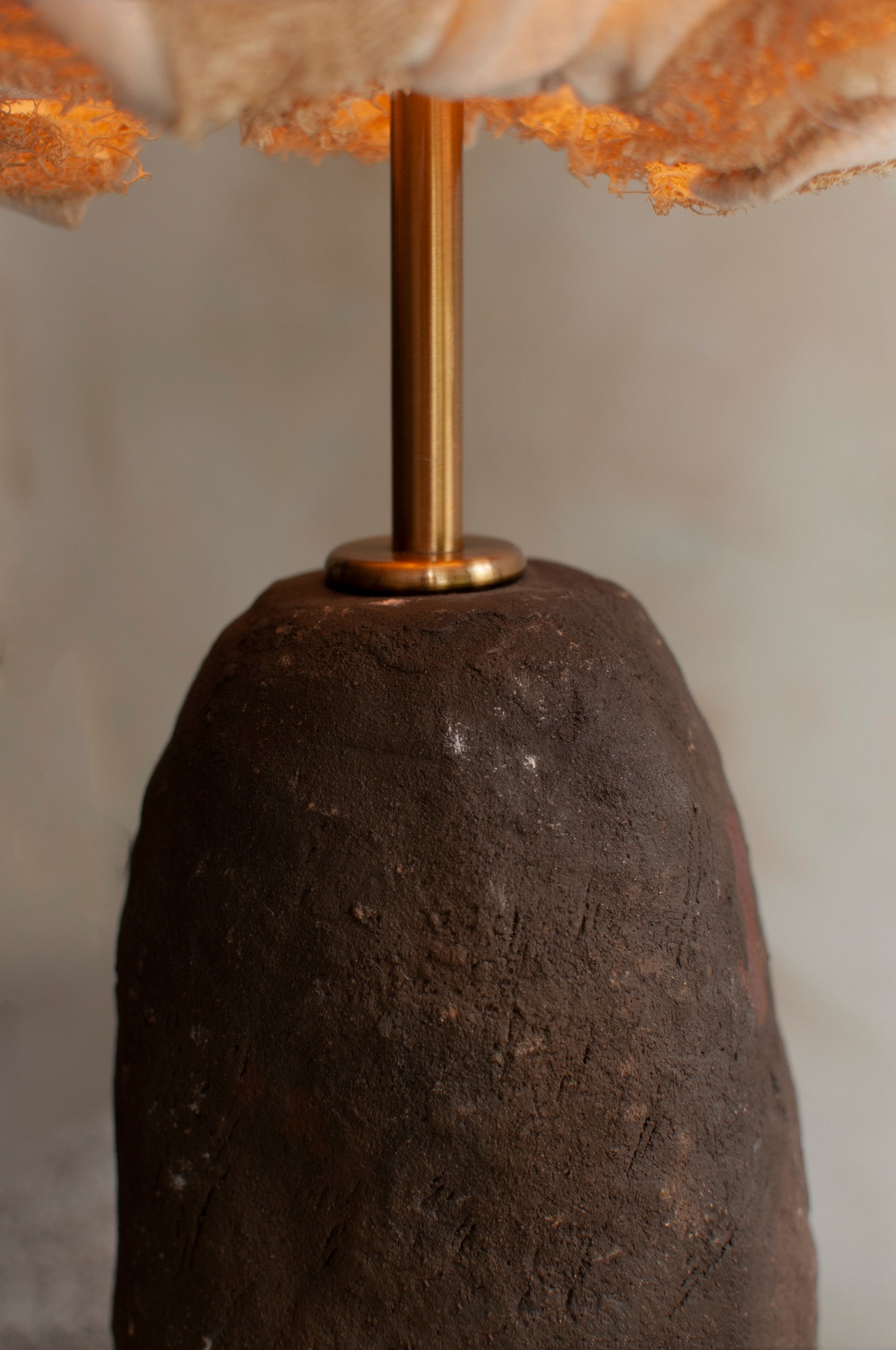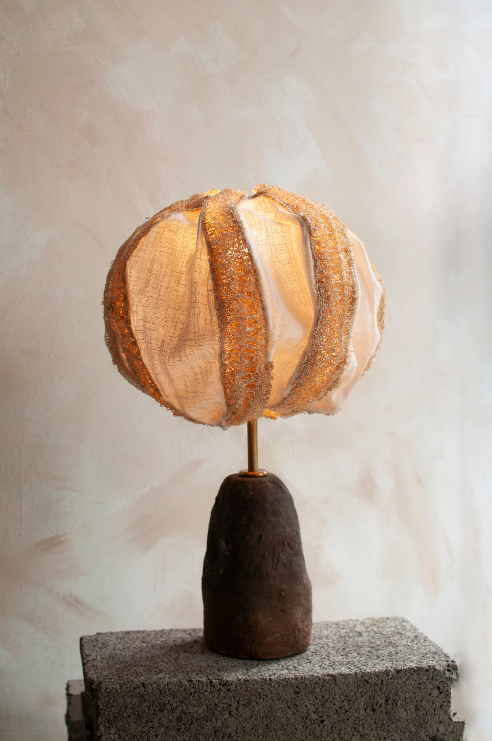 Diese Tischleuchte kombiniert einen von Hand geformten Keramikfuß mit einem Schirm aus tropischer Luffa-Frucht und feinem Leinen. Details spiegeln die Sorgfalt traditioneller Handwerkstechniken wider.