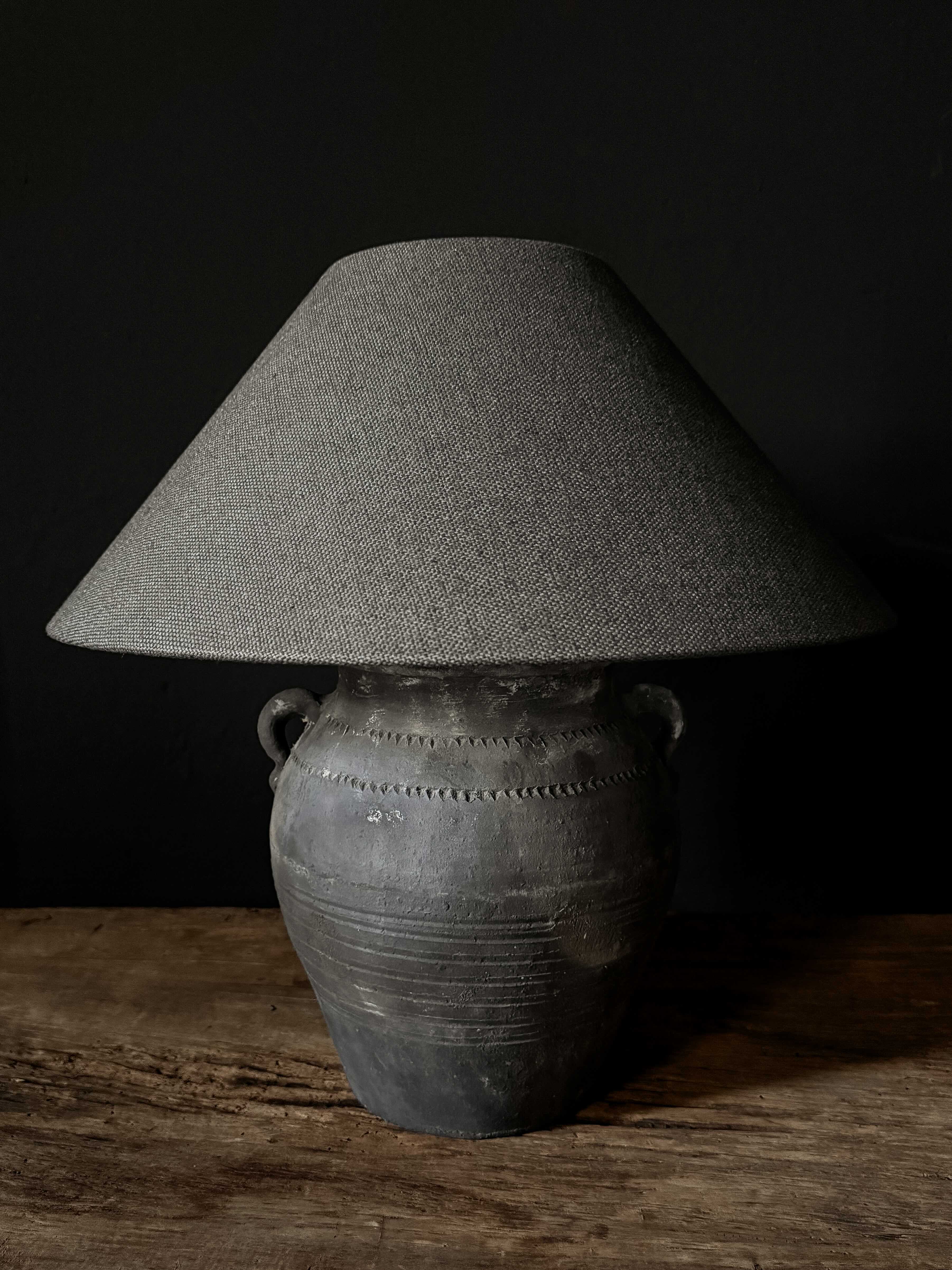 Diese einzigartige Tischlampe vereint Geschichte mit zeitloser Eleganz in dein Zuhause - gefertigt aus einem alten, grauen Keramikkrug und wird durch einen schlichten Lampenschirm aus Leinen stilvoll ergänzt.