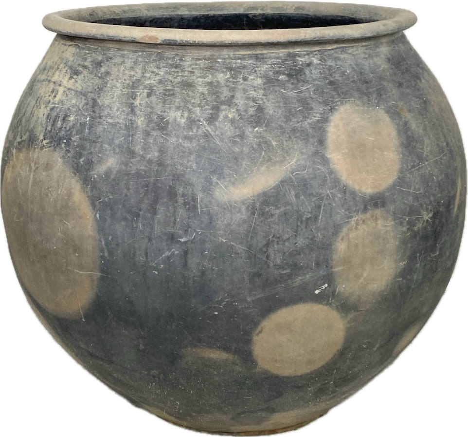 Dieser außergewöhnliche Pott stammt aus China und datiert auf etwa 1850. Gefertigt aus unglasierter Keramik, beeindruckt er durch seine seltene, nahezu kugelrunde Form und imposante Größe.