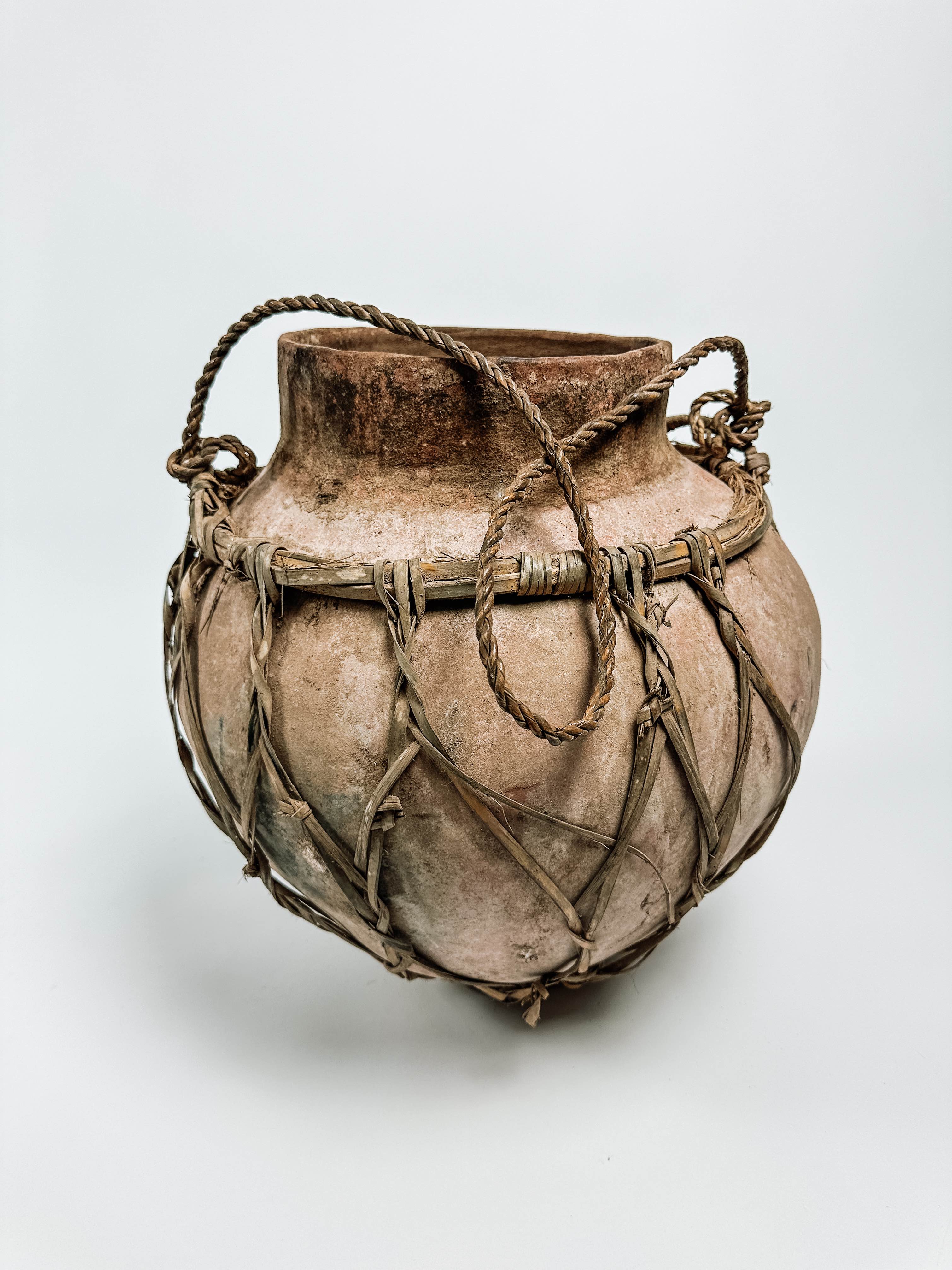 Diese Terracotta Töpfe aus Sumba sind - in gut erhaltenem Zustand - recht selten zu finden. Jeder Topf ist ein Unikat und außergewöhnlich ummantelt von einem Pflanzen- und Schnurgeflecht. Ursprünglich verwendet zur Lagerung von Palmenzucker.