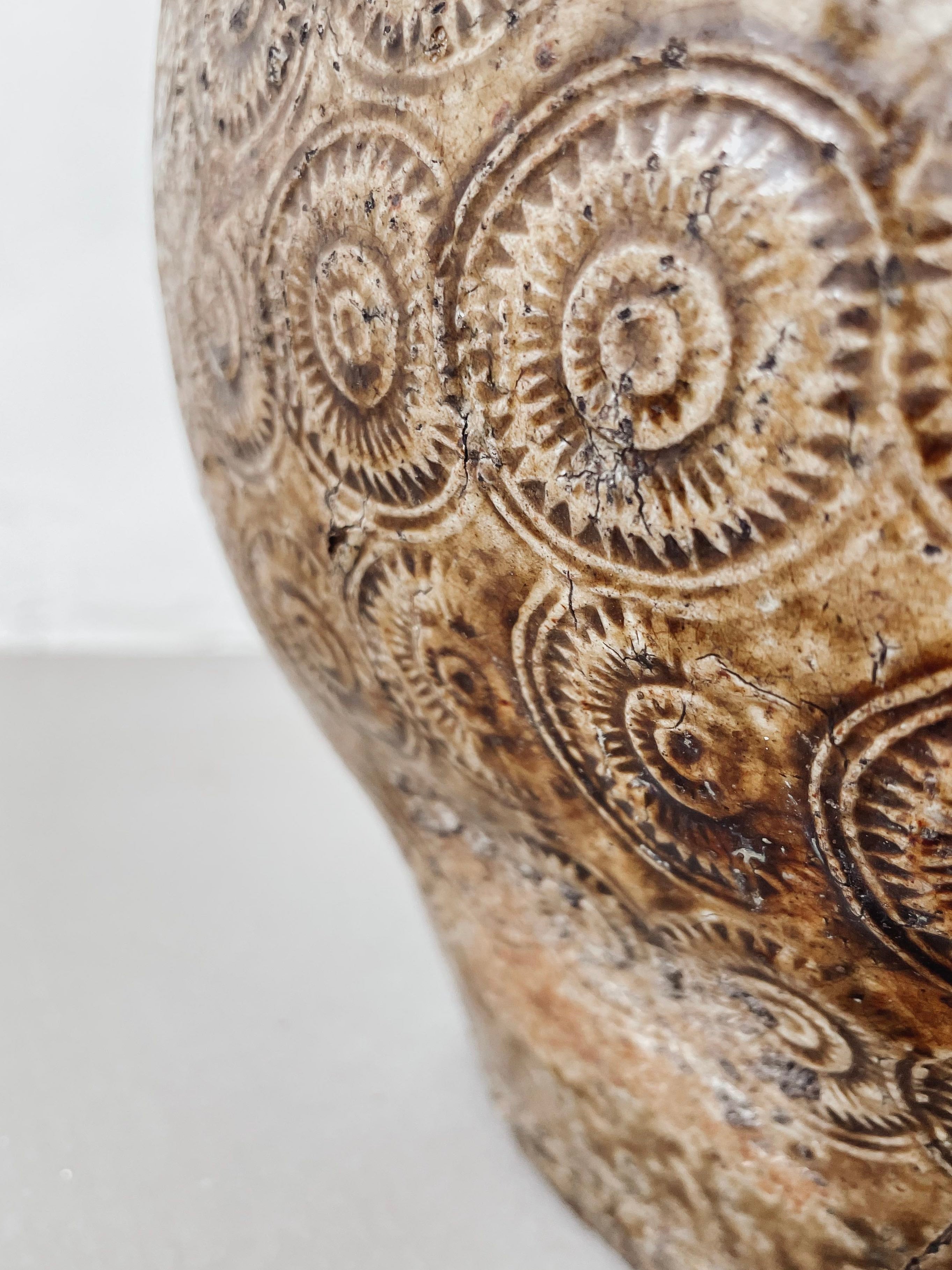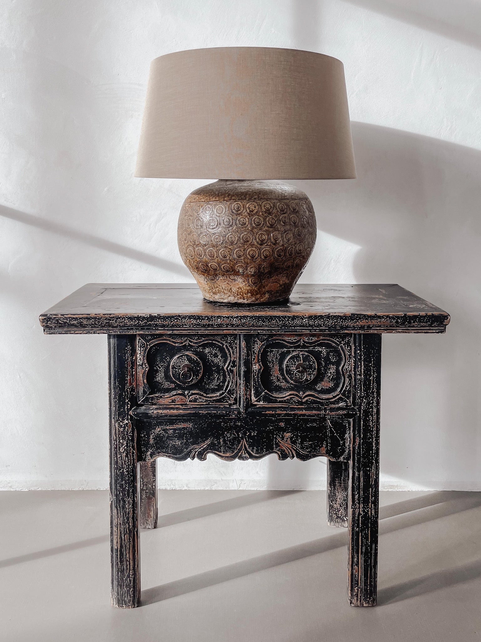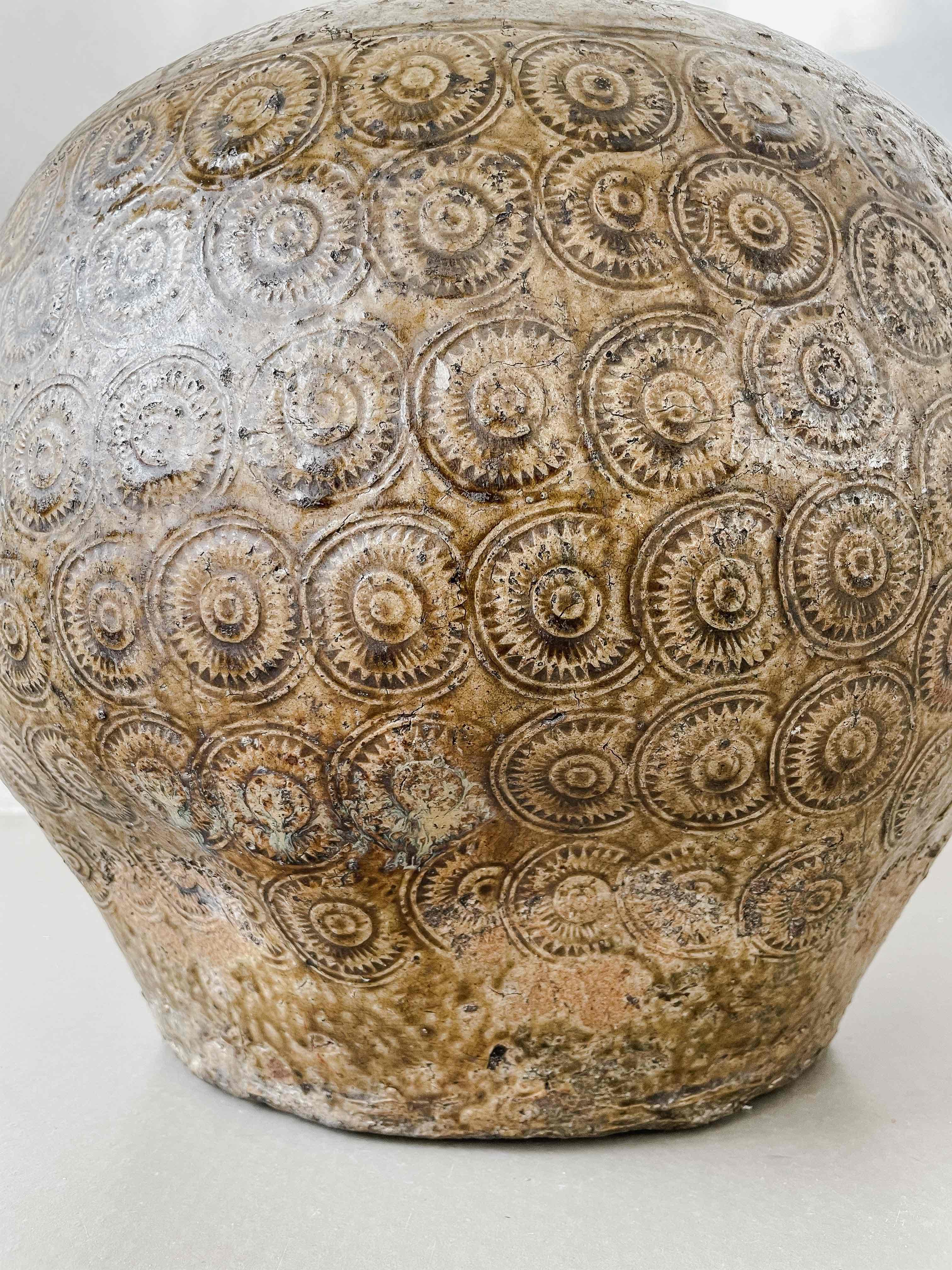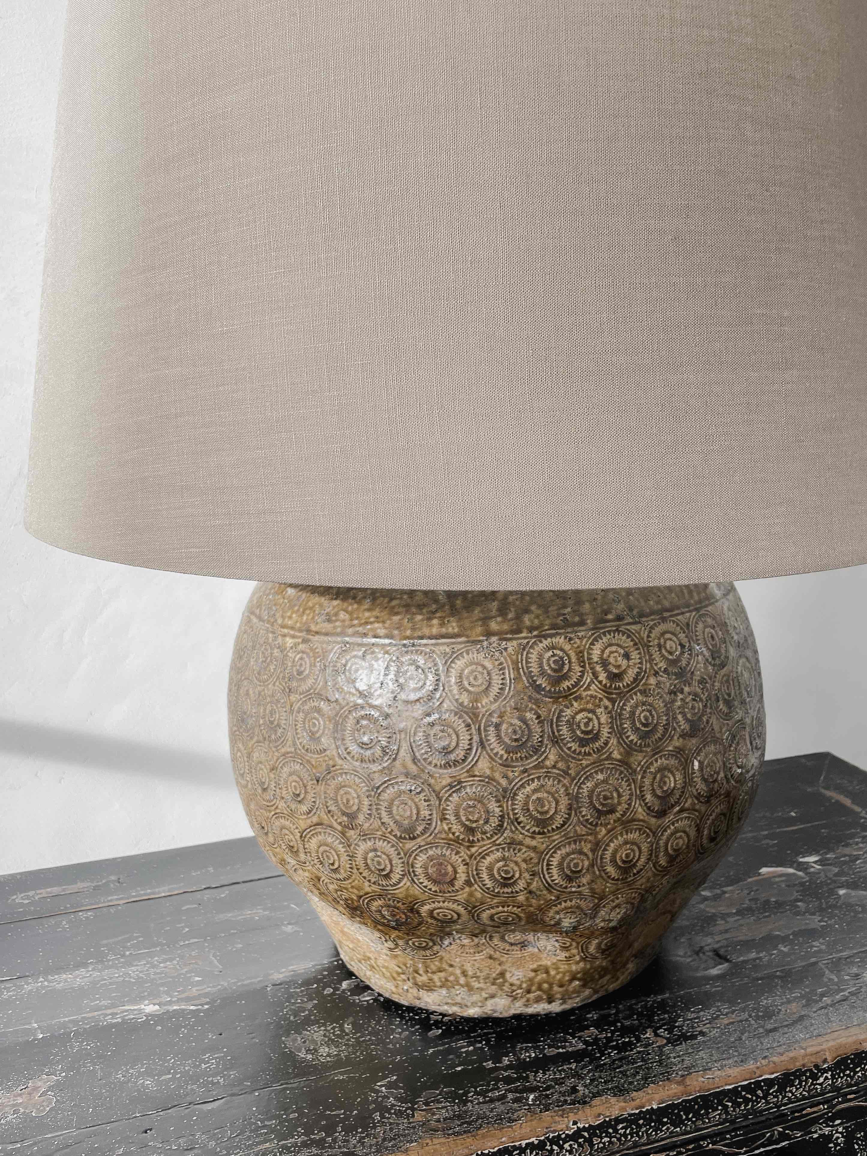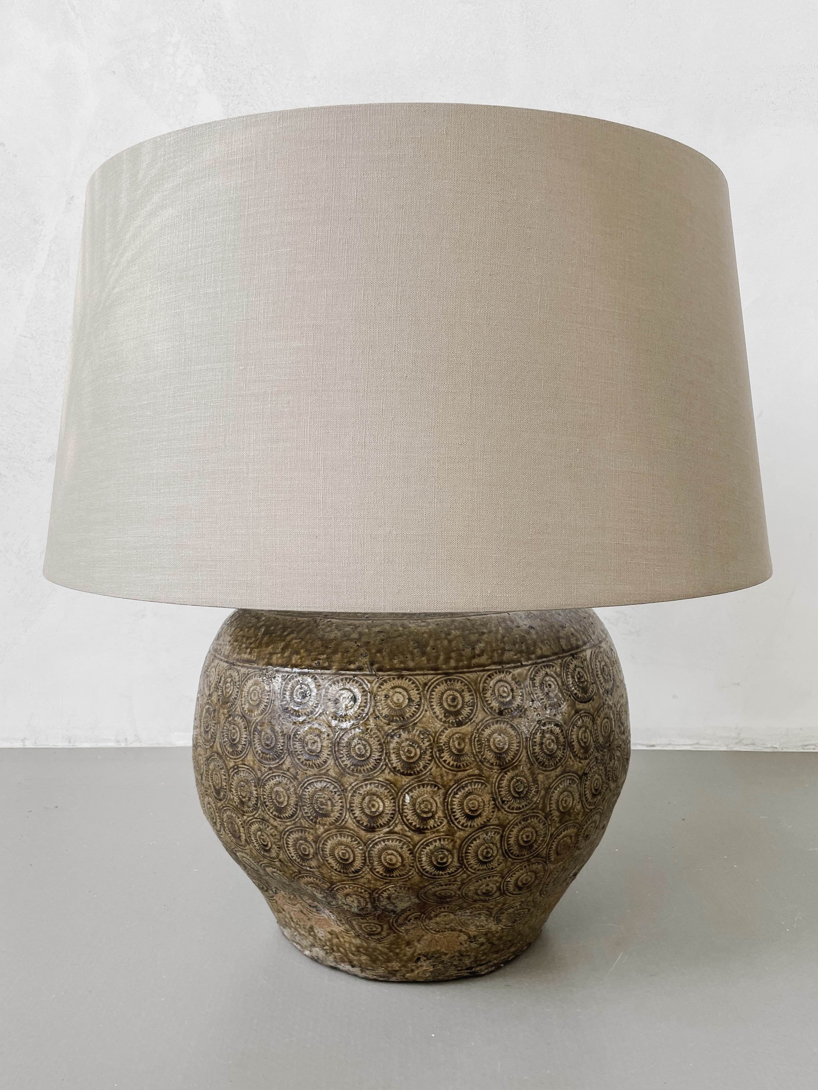 Antiker und seltener gelb-grün-brauner Topf mit Muschel-Münz-Abdrücken von 1800 aus der Hunan Provinz in China. Einzigartig in der Ausführung als Tischlampe mit einem Lampenschirm aus Leinen.