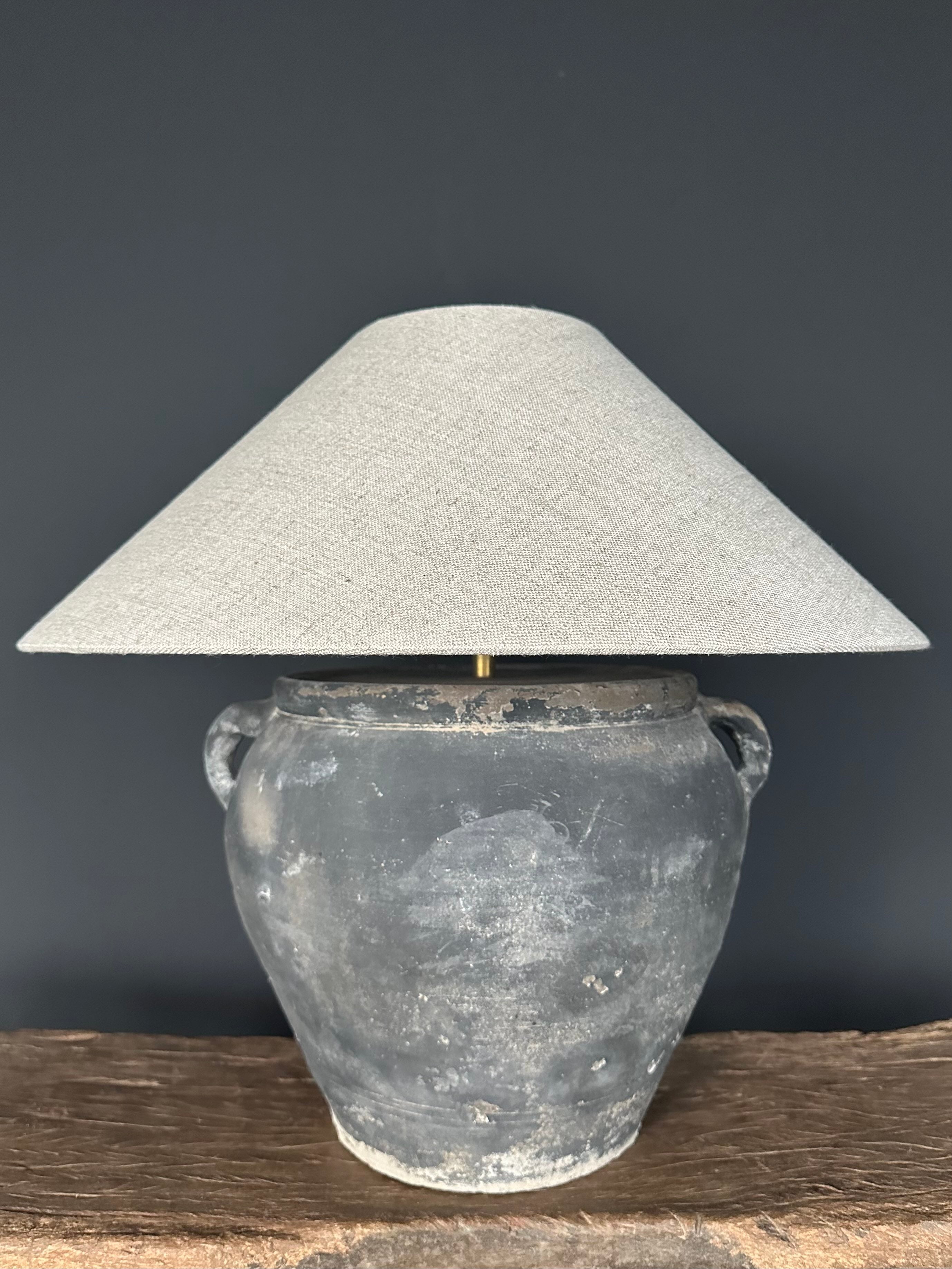Diese Tischlampe wurde aus einem alten chinesischen Topf gefertigt, der einst als Behälter für Wasser und Öl diente. Für den Lampenschirm haben wir uns für einen Kegel aus Leinen entschieden. Simple, but beautiful!