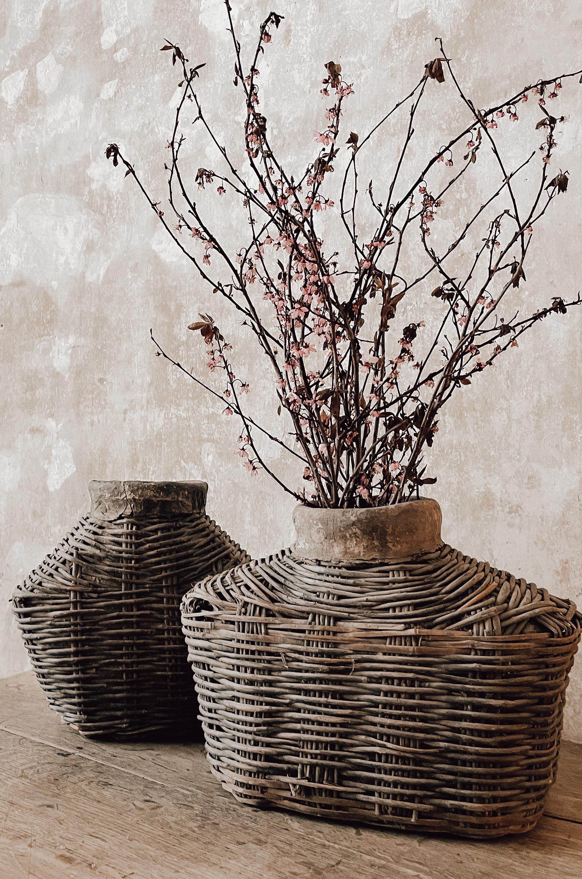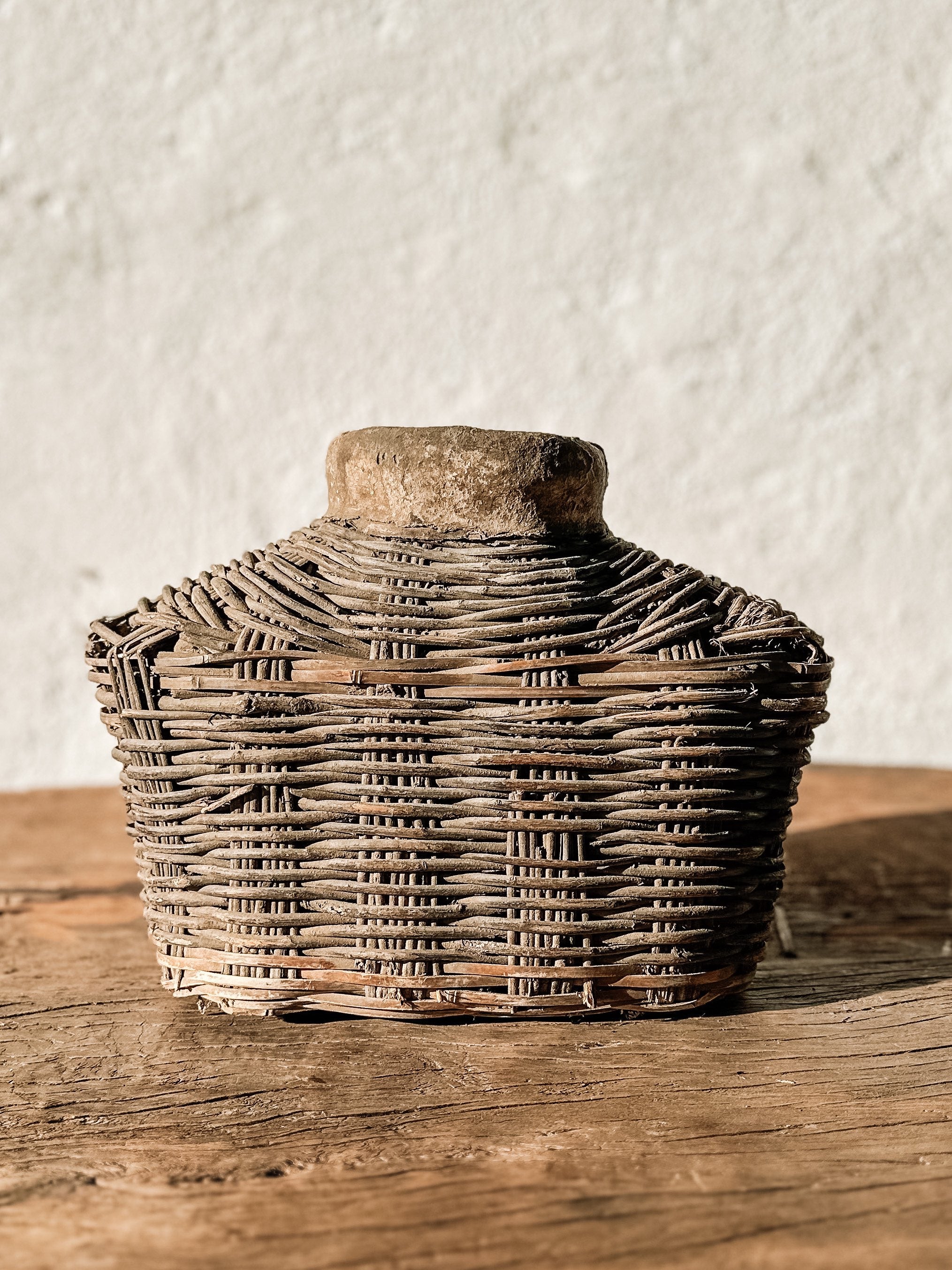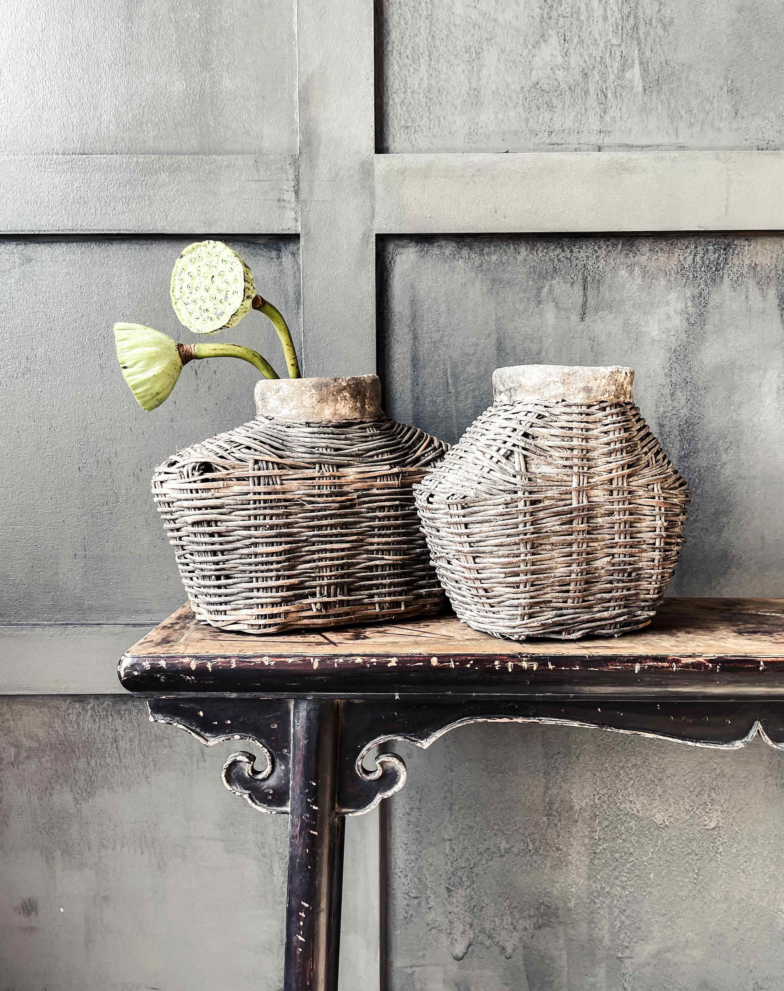 Die Körbe wurden früher in China verwendet, um Essig oder Öl zu lagern, wahrscheinlich für Lampen. Eine aufgetragene Lehm- bzw. Lederpaste schützte die Körbe vor Wasser. Im Laufe der Zeit ist die Paste gerissen, und eine einzigartige Patina ist auf der Oberfläche entstanden.