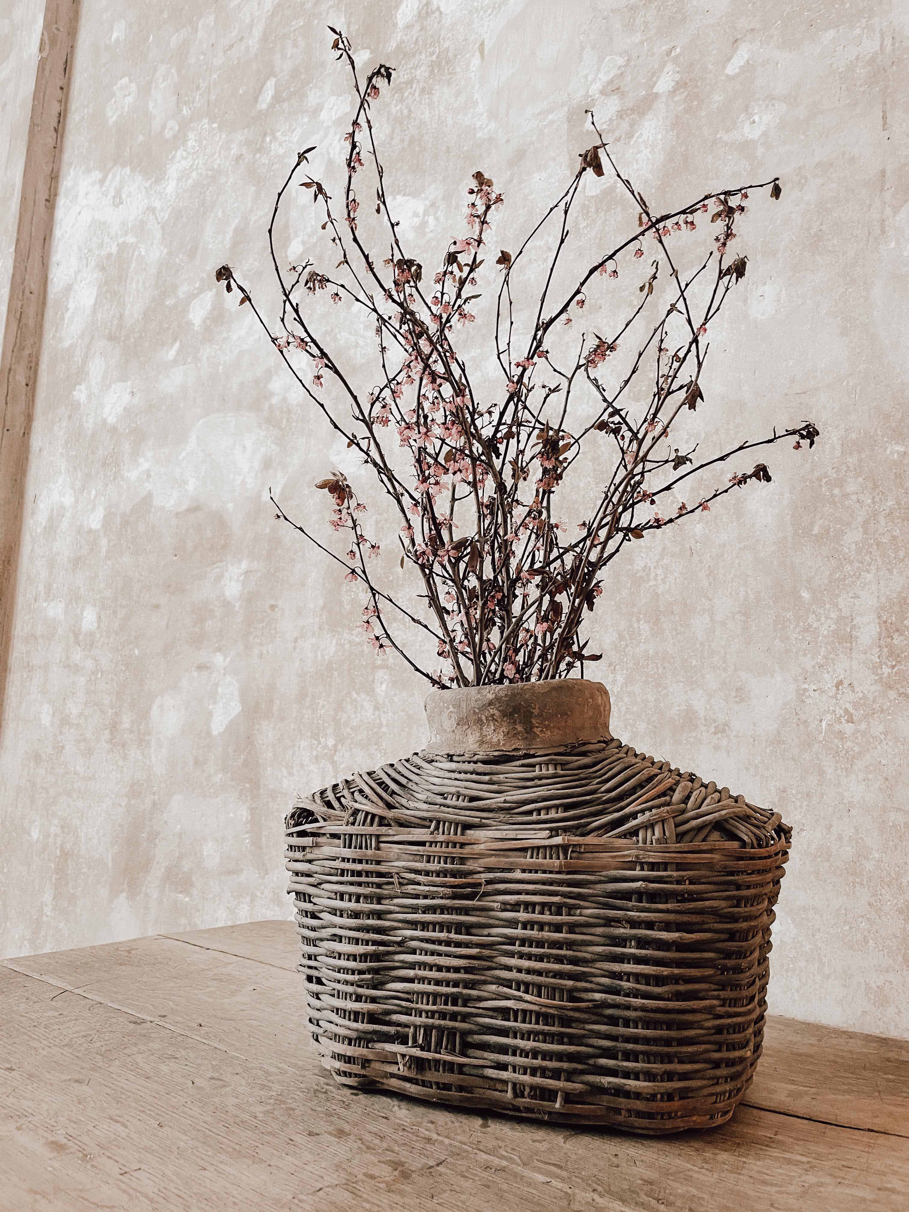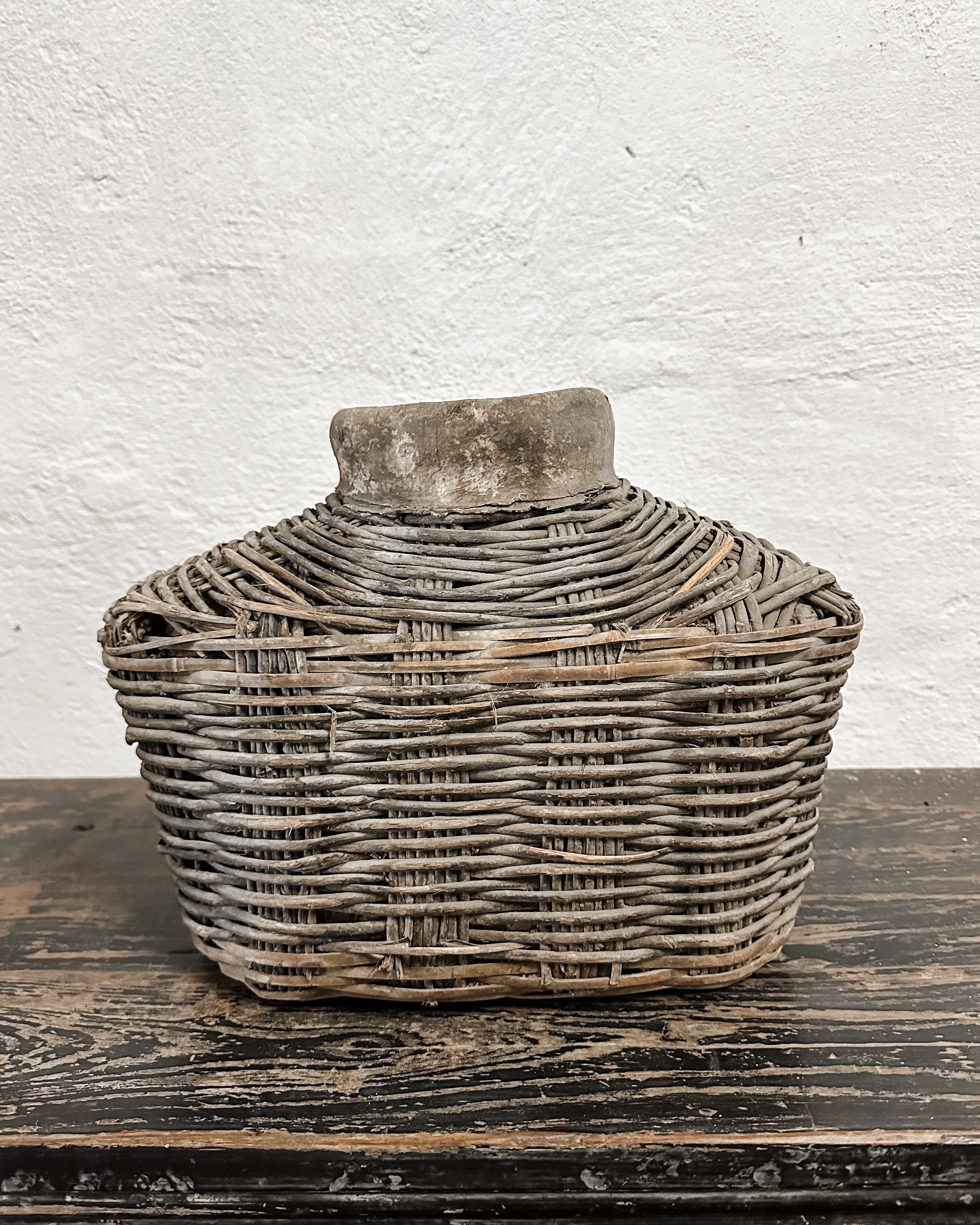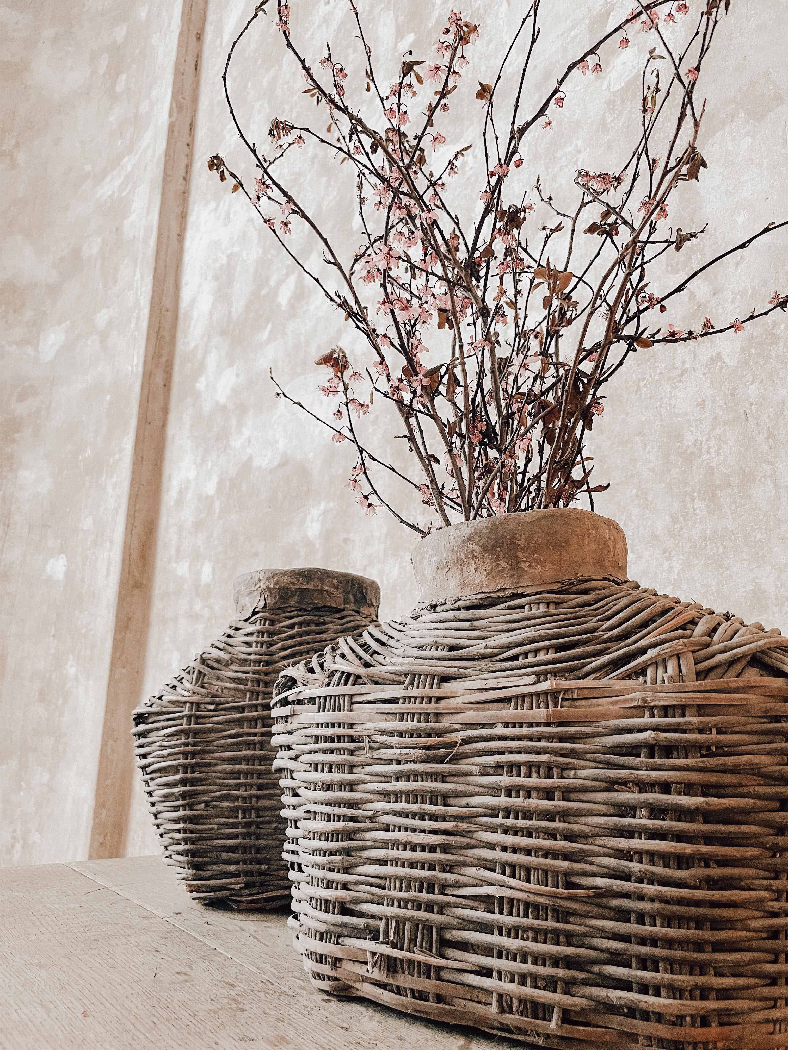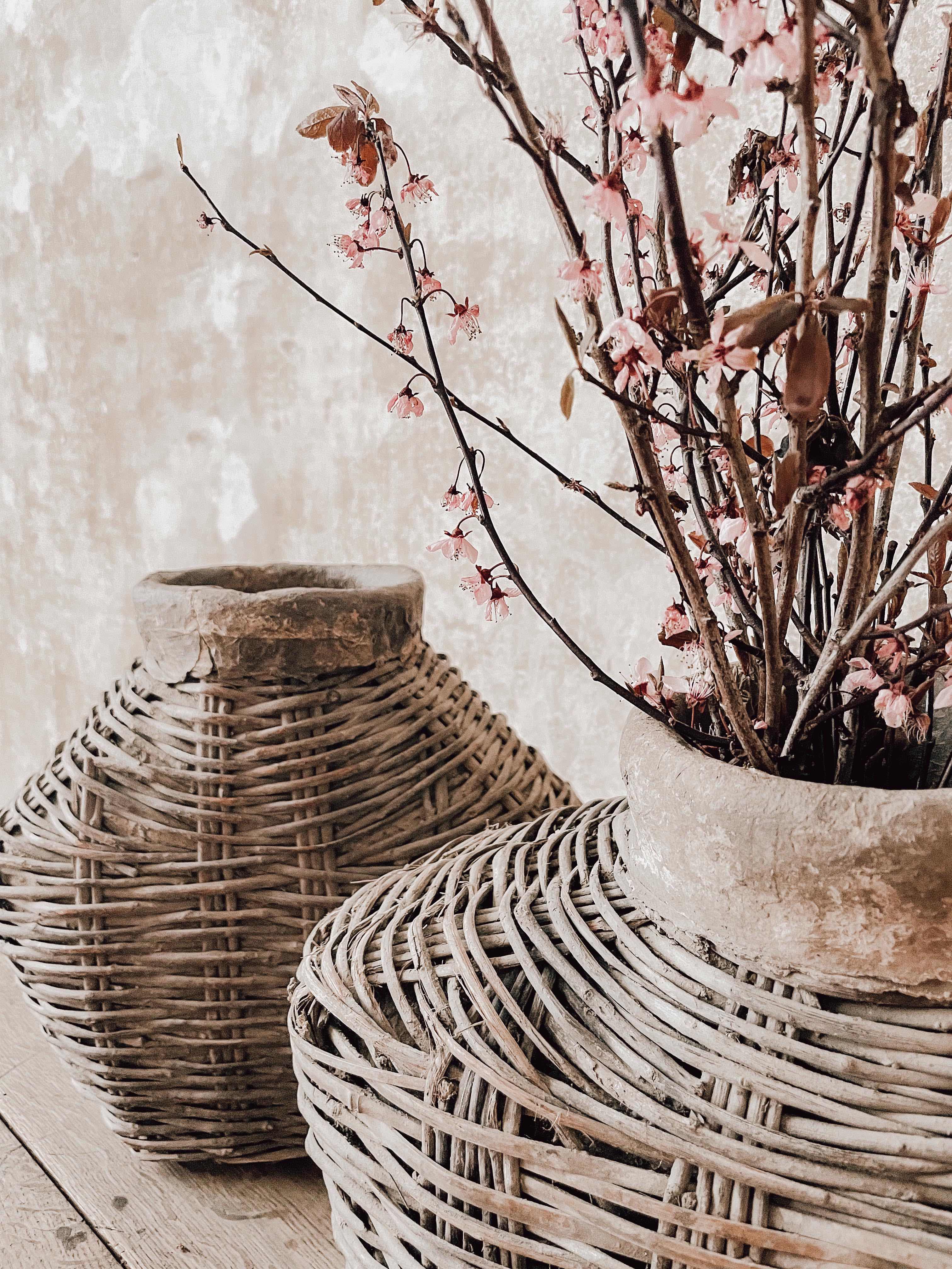 Die Körbe wurden früher in China verwendet, um Essig oder Öl zu lagern, wahrscheinlich für Lampen. Eine aufgetragene Lehm- bzw. Lederpaste schützte die Körbe vor Wasser. Im Laufe der Zeit ist die Paste gerissen, und eine einzigartige Patina ist auf der Oberfläche entstanden.