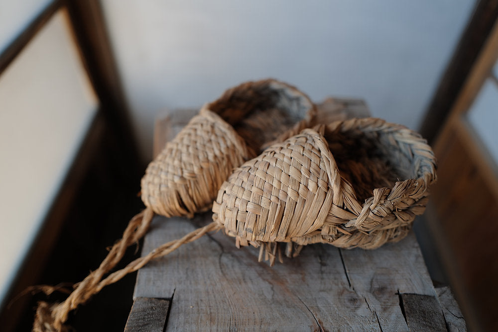 Ein außergewöhnliches Dekoobjekt: handgestrickte Kinder Strohschuhe aus Japan. Hergestellt im späten 20. Jahrhundert in der Präfektur Gunma in Zentraljapan.