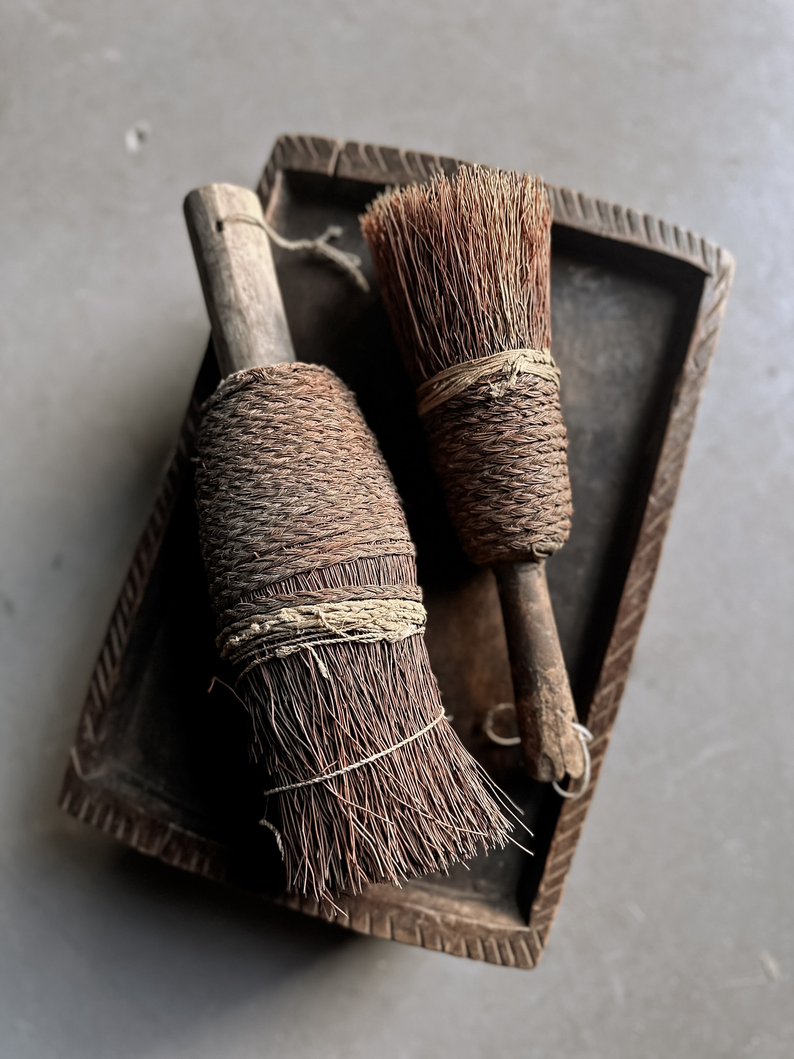 Vintage-Pinsel aus Holz, Seil und Zweigen. Zum Auftragen von Leim auf Rollrahmen oder Holz. Heute dient er als schönes, authentisches Dekorationsstück.