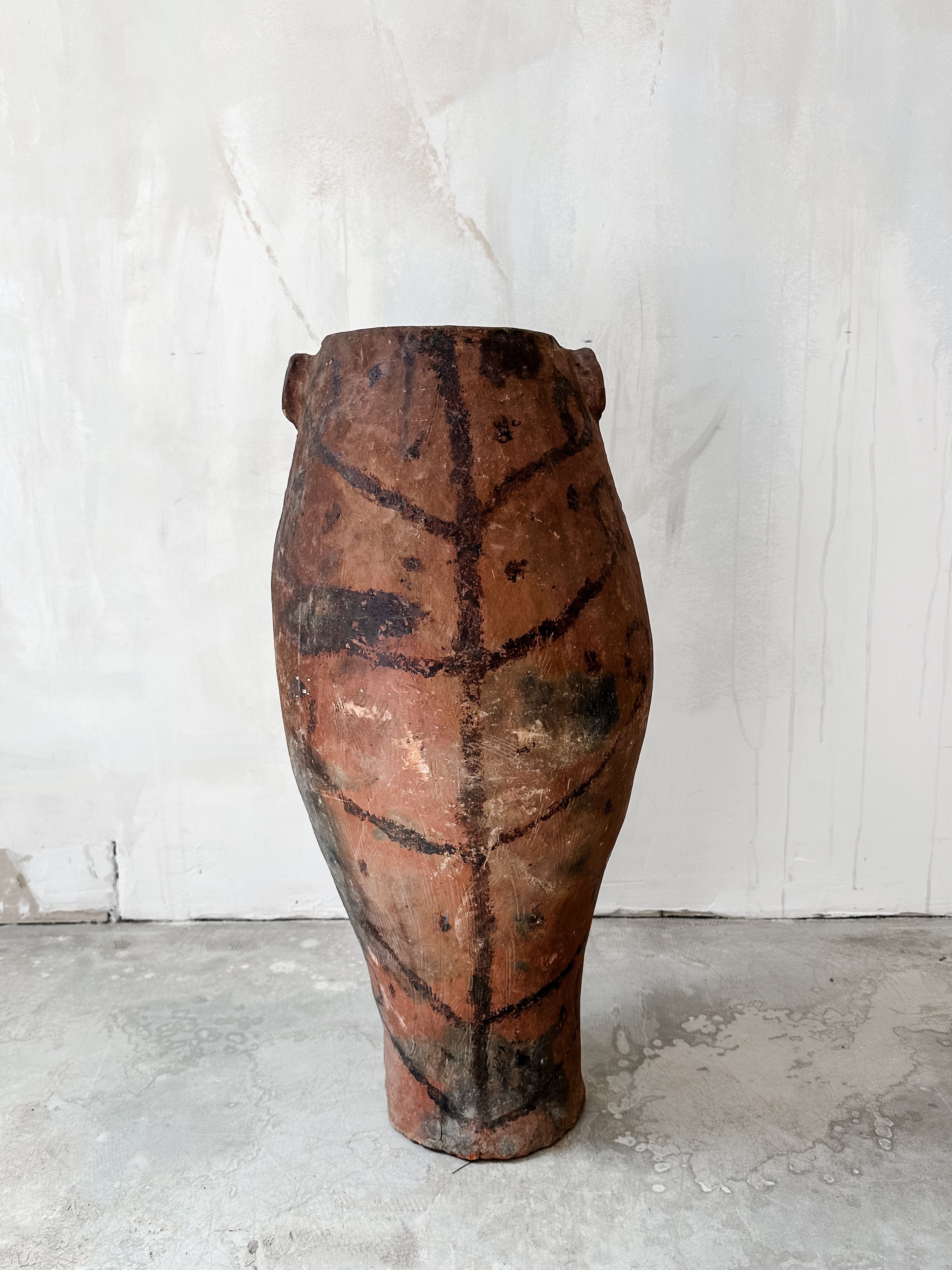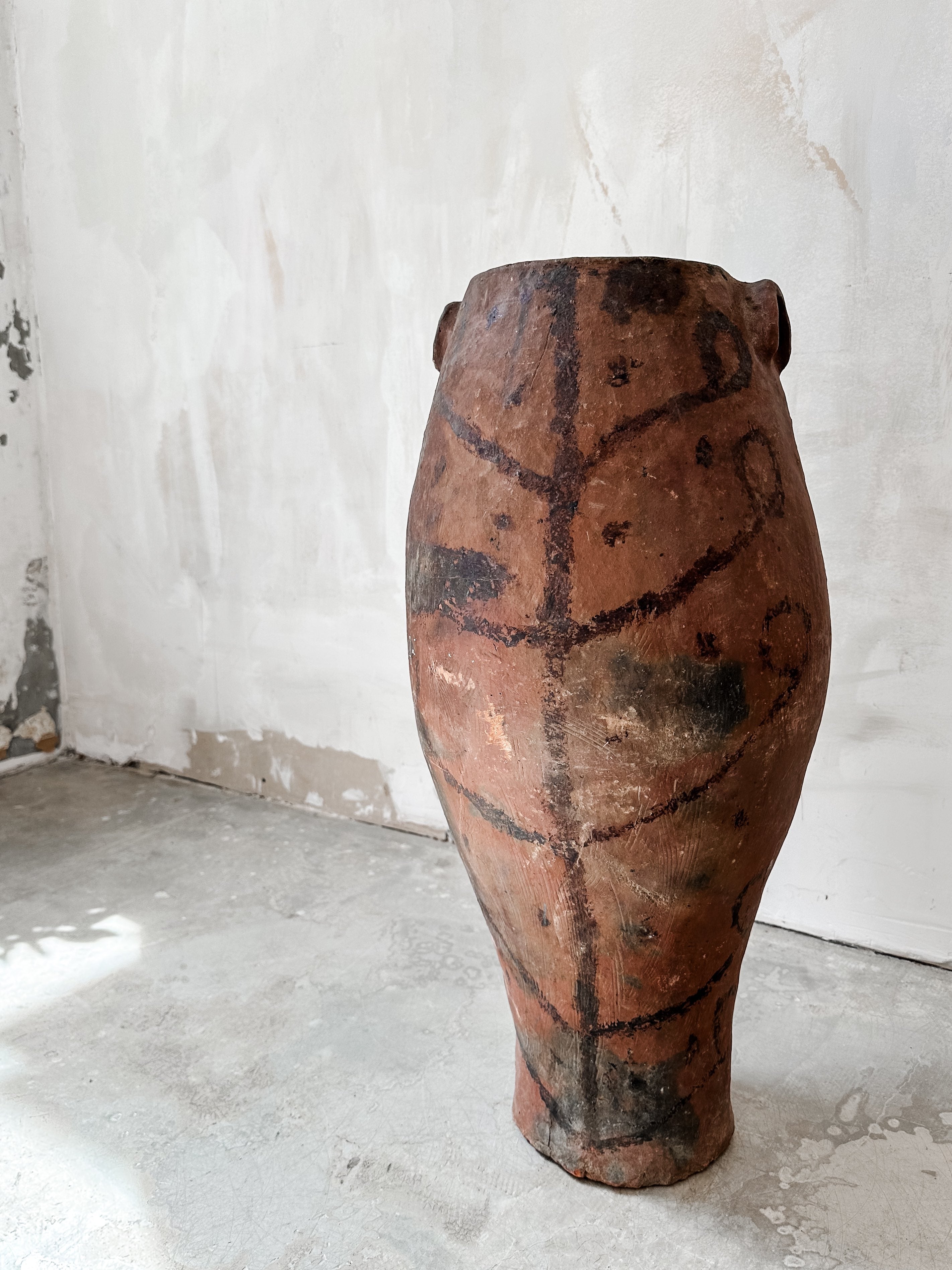 Diese Tontöpfe aus der Region Erzurum in Anatolien wurden in Dörfern zur Konservierung von Mehl und festen Lebensmitteln verwendet. Ihre Form ist charakteristisch: ein schmaler Körper, ein runder Bauch und bogenförmige Henkel nahe der Öffnung. Sie sind mit gemalten Motiven verziert und gut erhalten, da sie traditionell in Häusern aufbewahrt wurden.