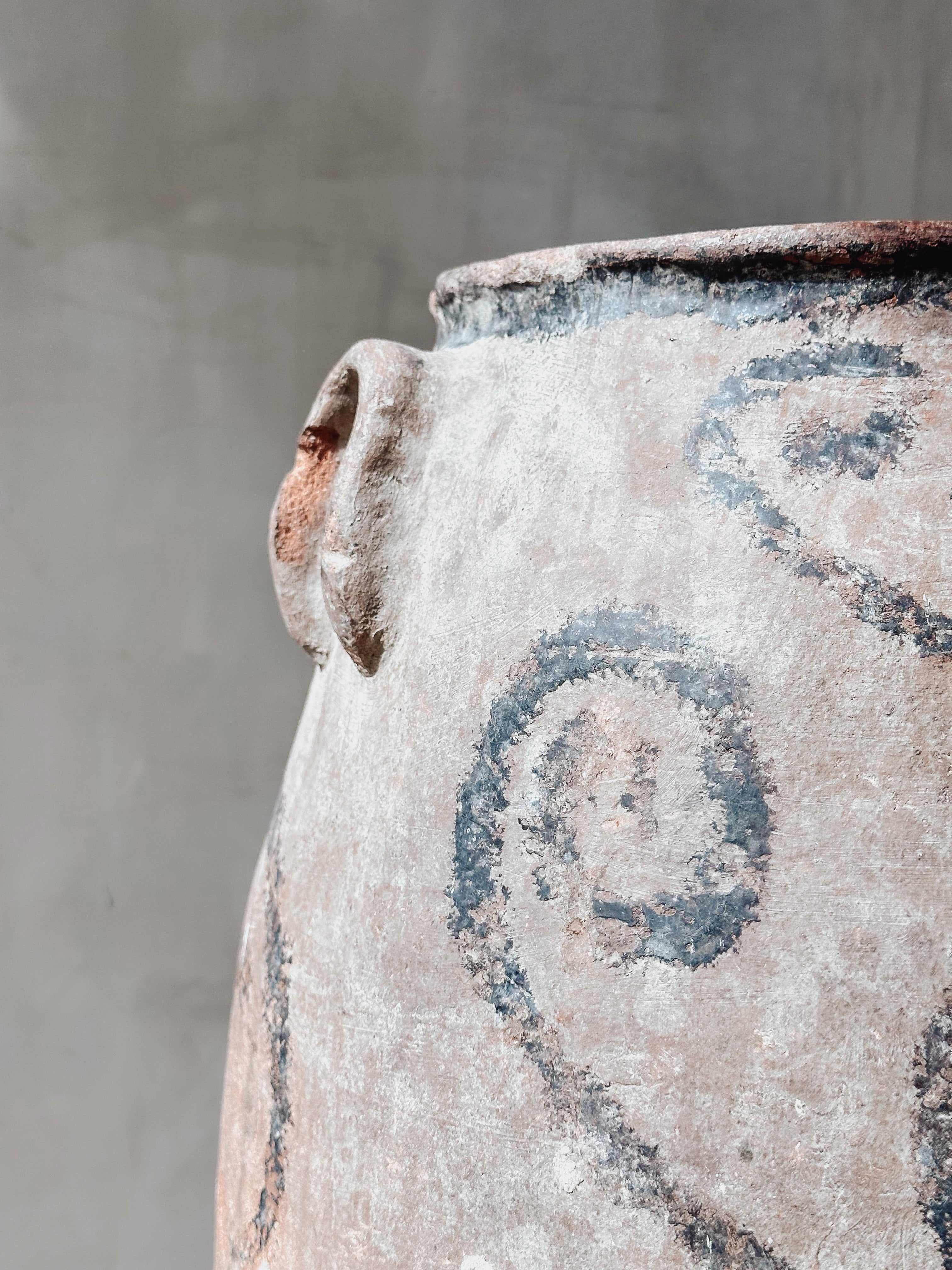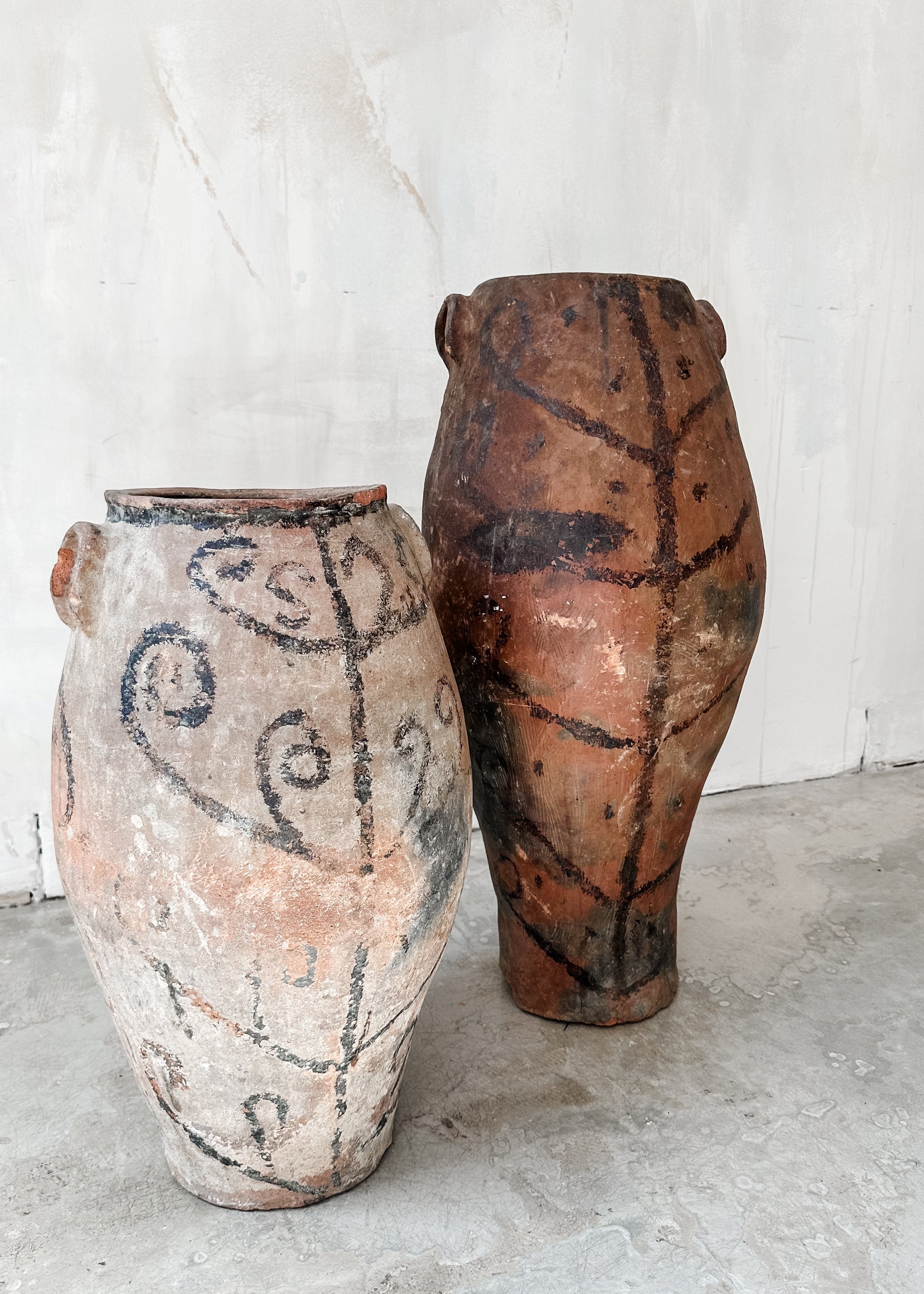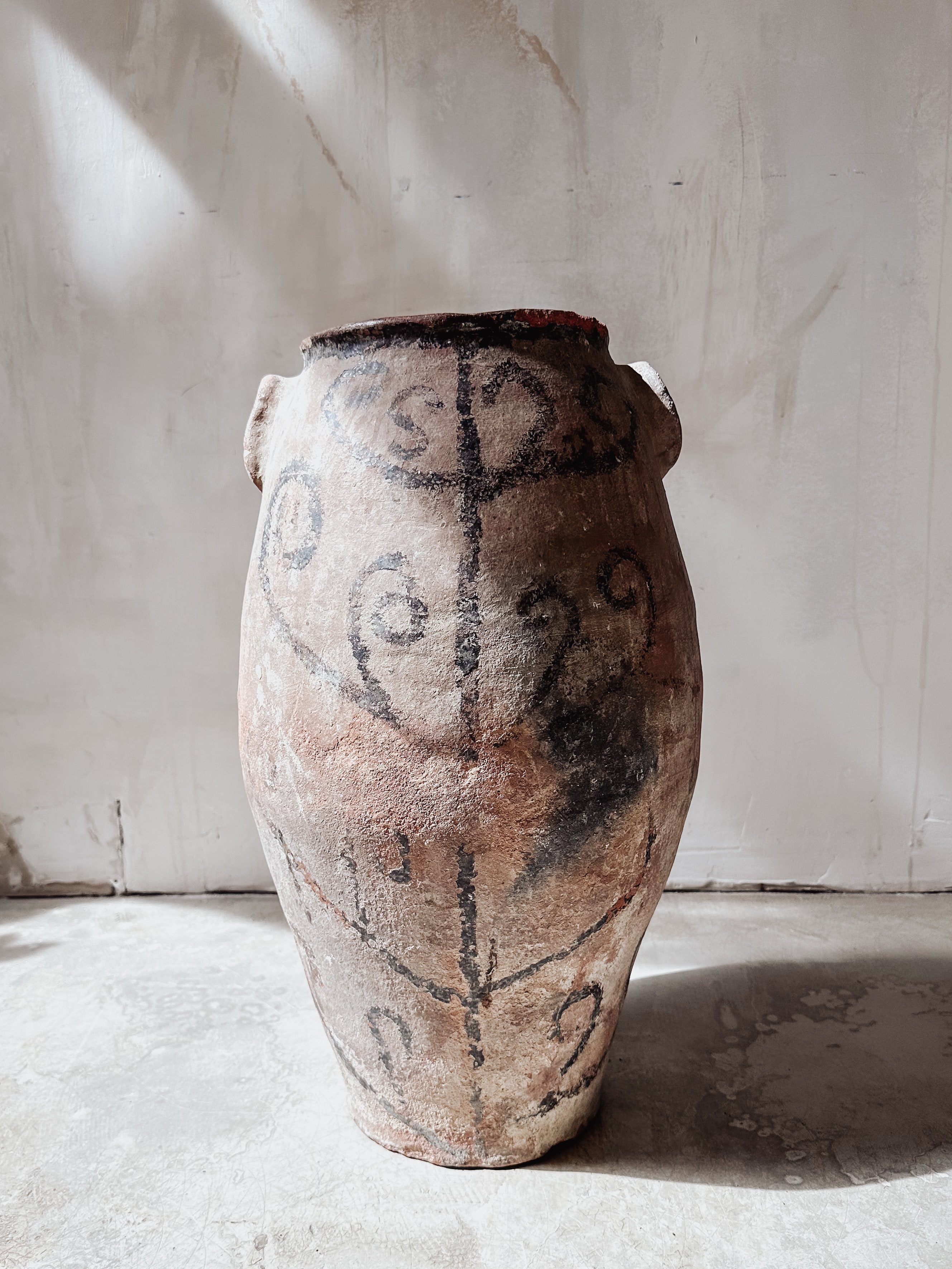 Diese Tontöpfe aus der Region Erzurum in Anatolien wurden in Dörfern zur Konservierung von Mehl und festen Lebensmitteln verwendet. Ihre Form ist charakteristisch: ein schmaler Körper, ein runder Bauch und bogenförmige Henkel nahe der Öffnung. Sie sind mit gemalten Motiven verziert und gut erhalten, da sie traditionell in Häusern aufbewahrt wurden.