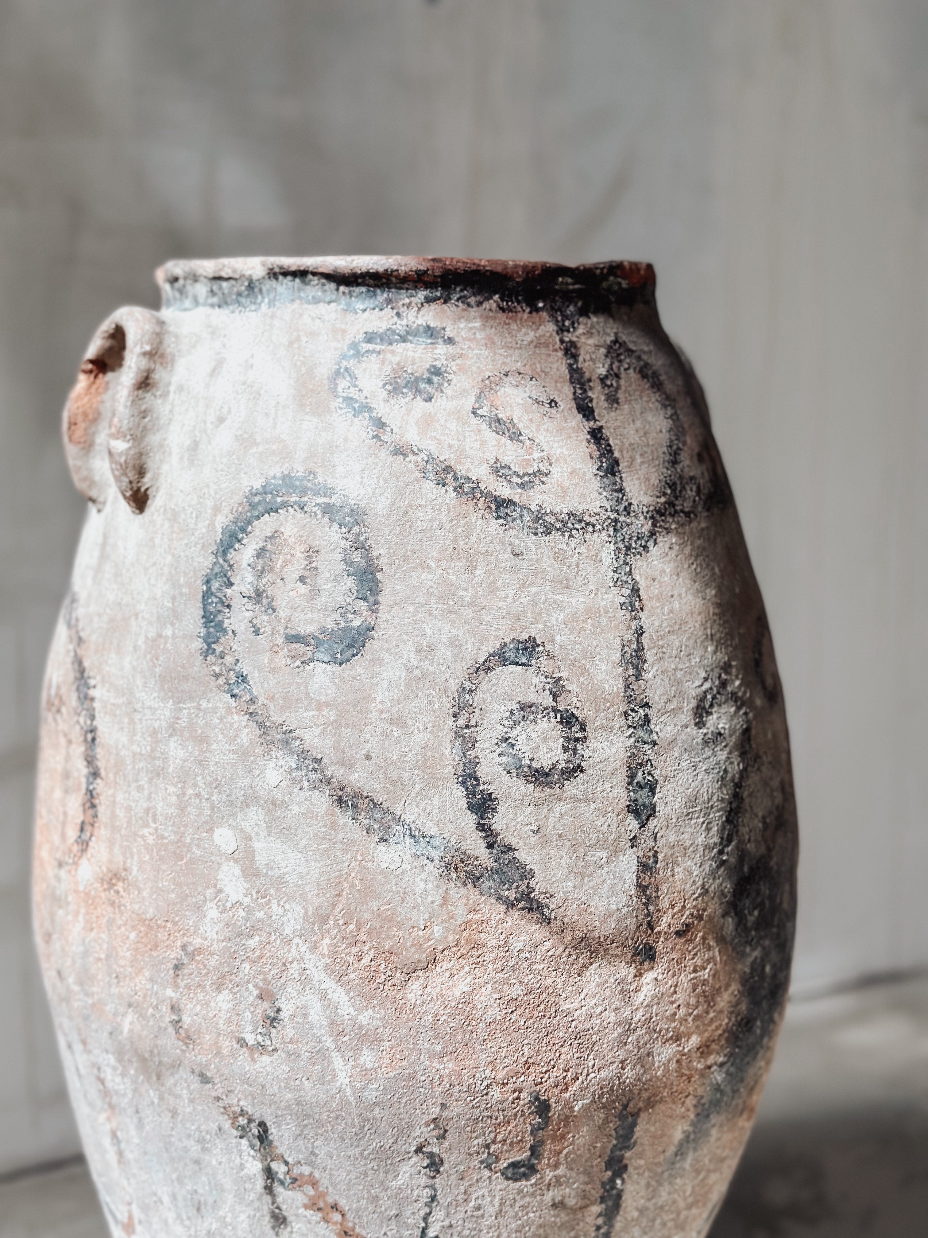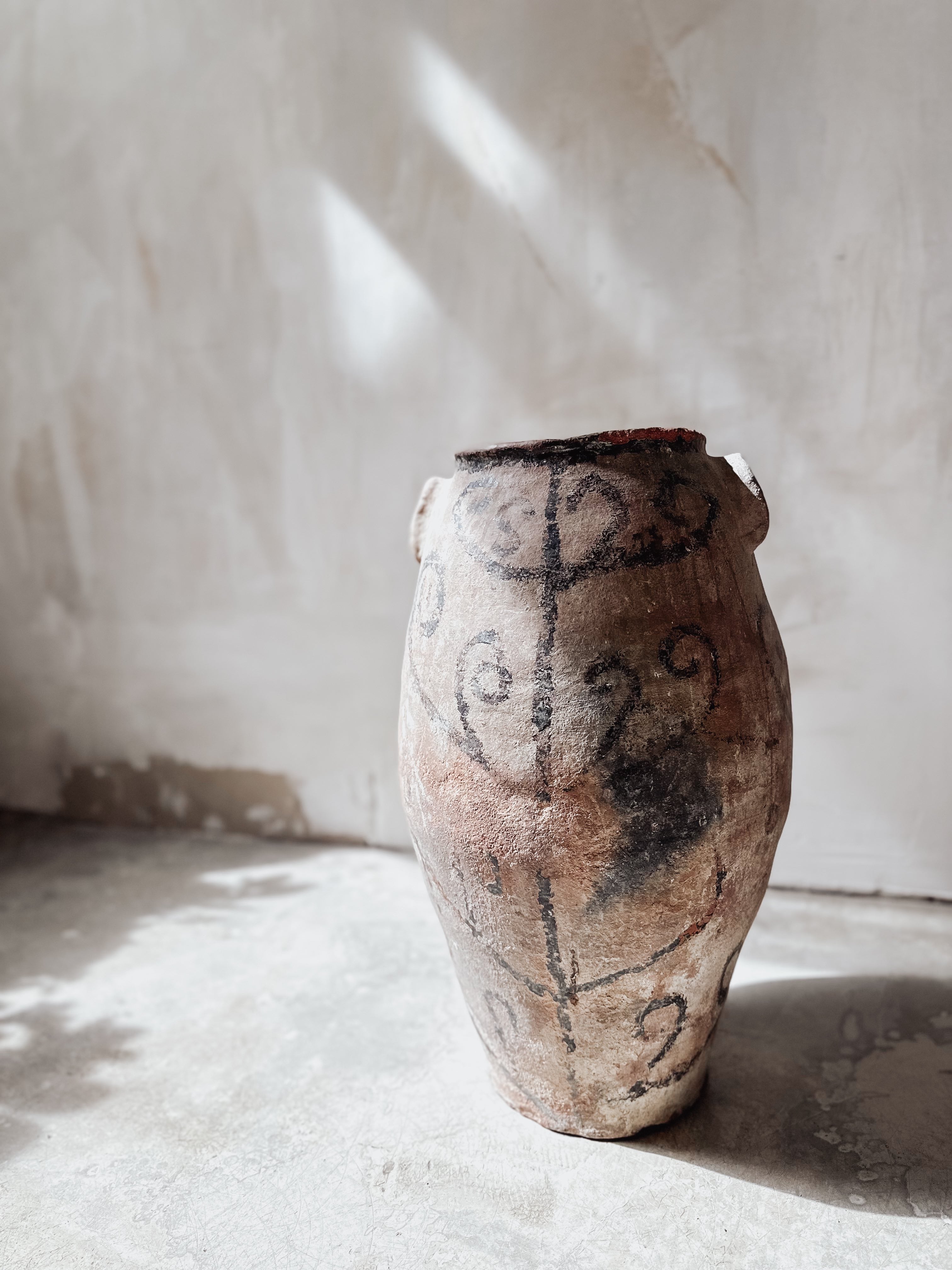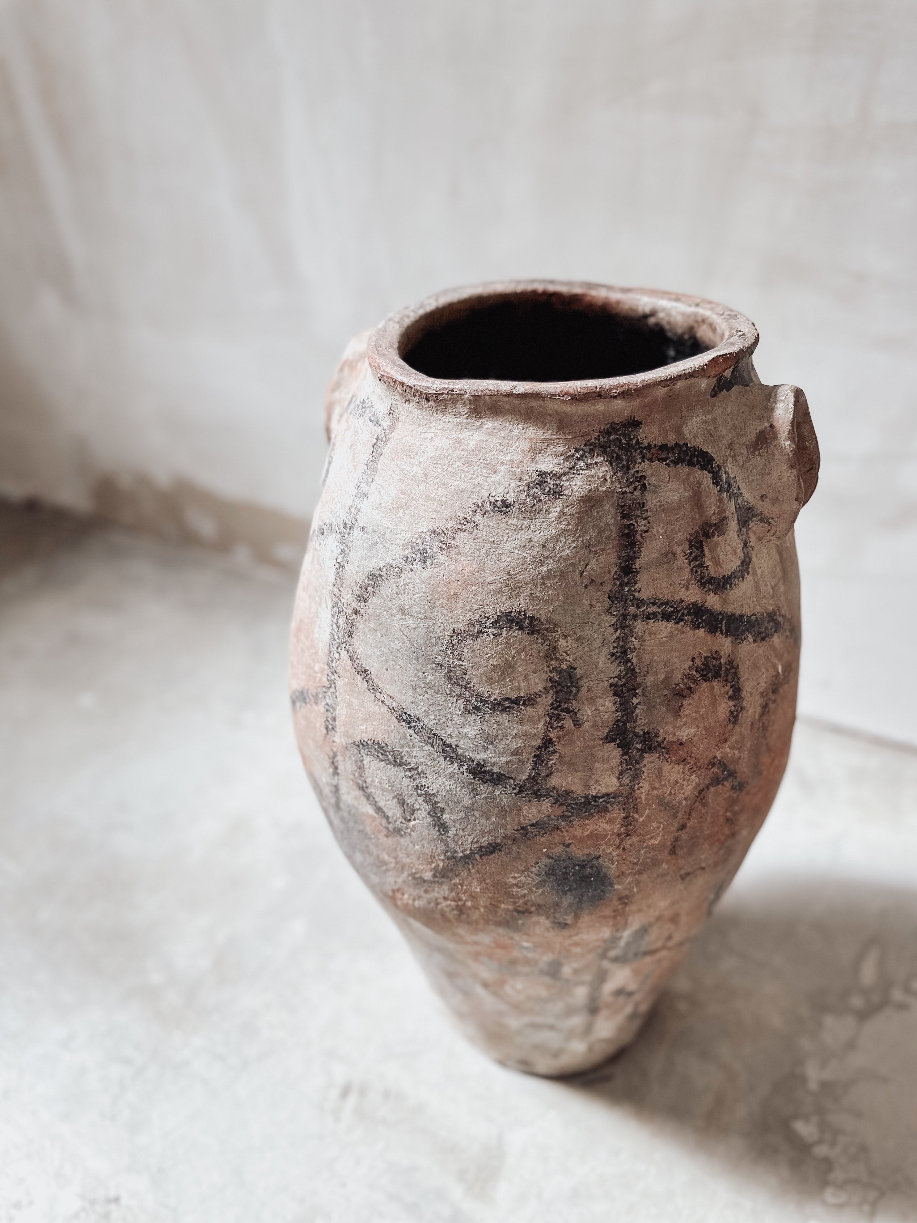 Diese Tontöpfe aus der Region Erzurum in Anatolien wurden in Dörfern zur Konservierung von Mehl und festen Lebensmitteln verwendet. Ihre Form ist charakteristisch: ein schmaler Körper, ein runder Bauch und bogenförmige Henkel nahe der Öffnung. Sie sind mit gemalten Motiven verziert und gut erhalten, da sie traditionell in Häusern aufbewahrt wurden.